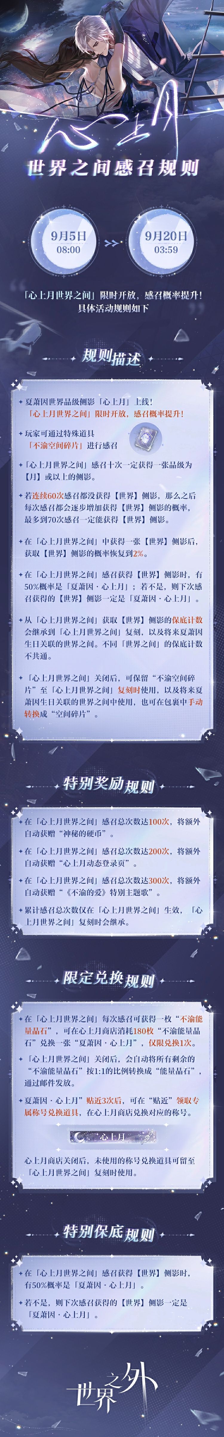 9月5日08:00-9月20日03:59「心上月世界之间」限时开放,感召概率提升!具体活动规则如下: 🌙「心上月世界之间」感召规则 ✦【世界】等级侧影感召概率限时提升,玩家可使用特殊道具“不渝空间碎片”进行感召。 ✦若连续60次感召都没获得【世界】侧影,那么之后每次感召都会逐步增加获得【世界】侧影的概率,最多到70次感召一定能获得【世界】侧影。 ✦在「心上月世界之间」感召获得【世界】侧影时,有50