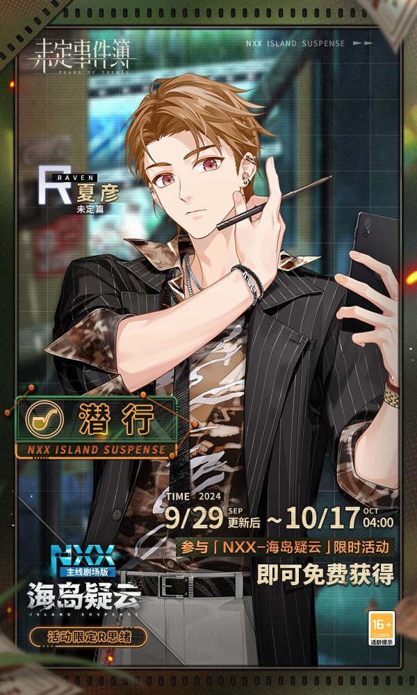 9月29日版本更新后,全新主线剧场版活动「NXX-海岛疑云」正式上线! ✨活动精彩纷呈 福利惊喜派送 -完成「NXX-海岛疑云」活动限时任务,可累计获得【女神之泪·限时】×11;完成活动限时签到,可累计获得【女神之泪·限时】×10 -完成第一阶段对应任务,可获得夏彦R思绪【潜行】、左然R思绪【猎逐】、莫弈R思绪【洞察】、陆景和R思绪【放怀】;完成所有男主结局,可获得活动名片【盛典 · 疑云】 -