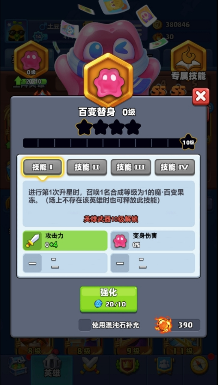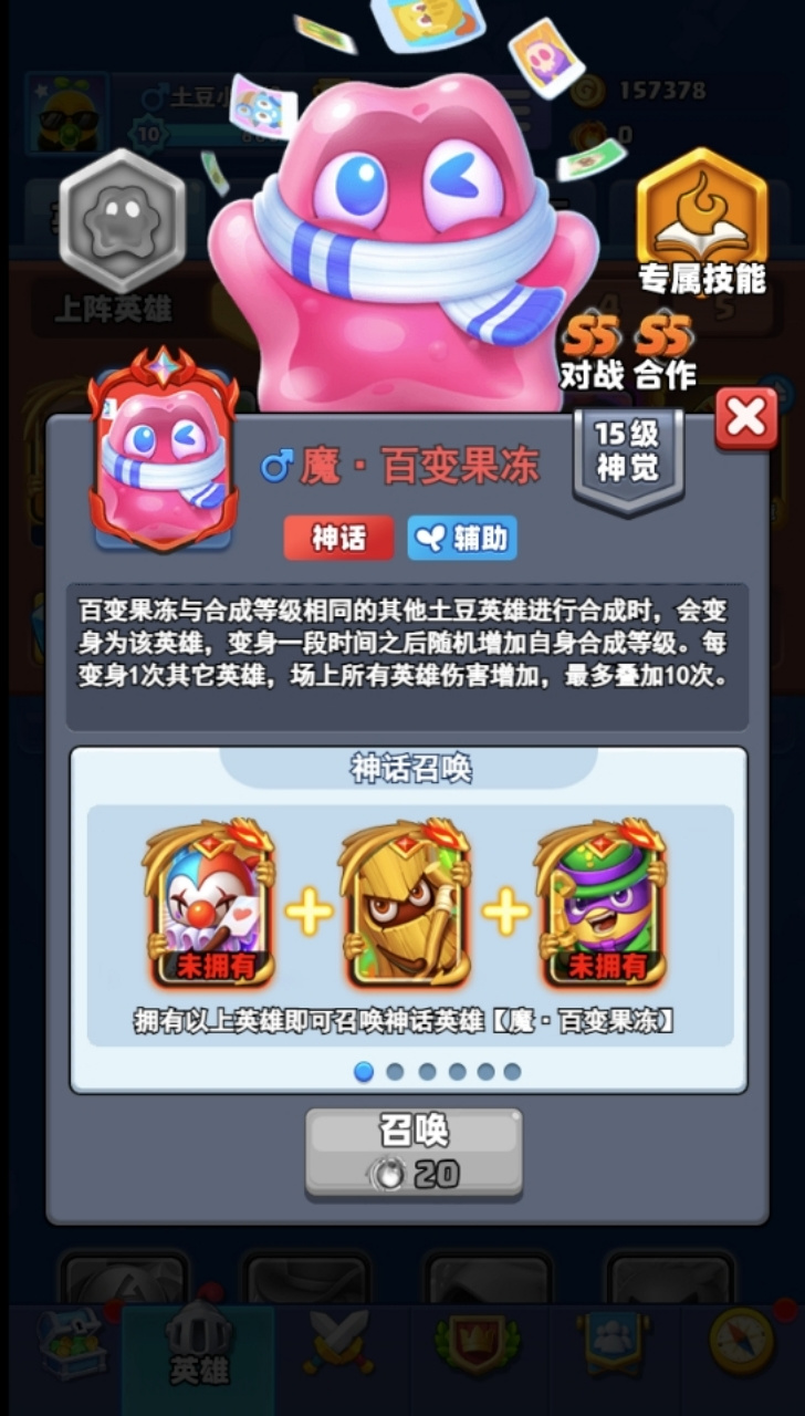 尊敬的召唤师: 感谢您对《土豆英雄》的大力支持,我们将在 12月3日 8:00-9:30 进行版本维护更新,期间暂时无法登录游戏,给您带来不便还望谅解。 更新时间 12月3日 8:00-9:30(提前维护结束后将提前开服) 【更新内容】 ⭐全新神话英雄⭐ 首位神话品质辅助英雄-魔·百变果冻,变幻莫测,百变身躯! 1、技能说明:百变果冻与合成等级相同的其他土豆英雄进行合成时,会变身为该#土豆英雄更新公告