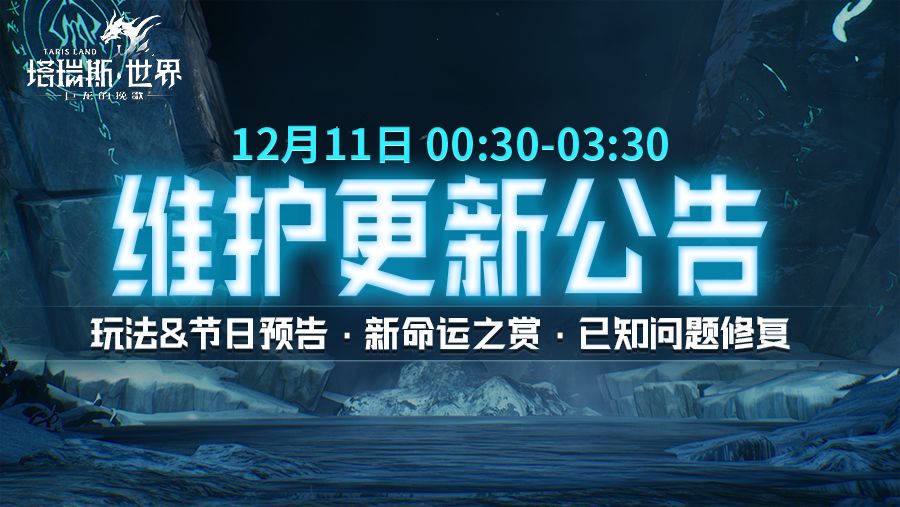 本周更新公告已送达!游戏将于12月11日(周三)凌晨进行维护更新。 活动玩法秘境/团本冲层&节日活动「霜辉节」预告已送达,全新命运之赏奖池上新。另有已知问题修复即将生效,下滑查看详情↓ 12月11日维护更新公告 亲爱的冒险者们: 我们将于12月11日00:30-03:30进行停服更新,本次更新预计持续3小时(最终时长以实际情况为准),请大家提前安排好游戏时间,感谢大家的持续支持! 在服务器重新开