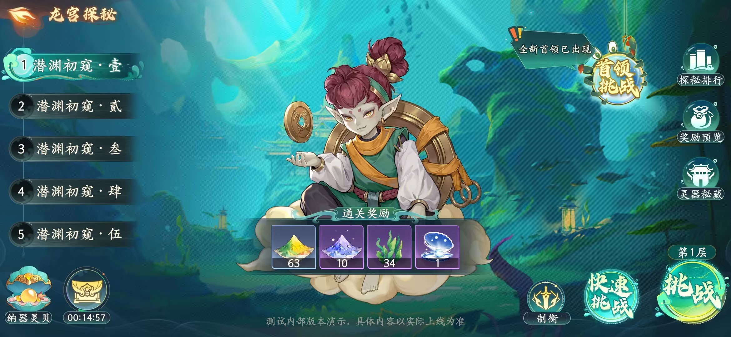 书灵们,陆地呆腻了是不是?玉兔这就带你们下海遛遛弯,全新玩法「龙宫探秘」即将上线!准备好迎接这场深海奇遇,神秘宝藏在等你哟! 闯关挑战: 深入龙宫,你将面临层层关卡的考验。每个关卡都隐藏着强大的敌人,战胜敌人就能获得丰厚奖励。记得选择适合自己的秘术,解锁强力羁绊效果,让灵器成为你的得力助手。 首领挑战: 每周一,龙宫深处都会出现一批强大的首领,等待你的挑战。别忘了合理分配挑战次数,利用策略和实力,