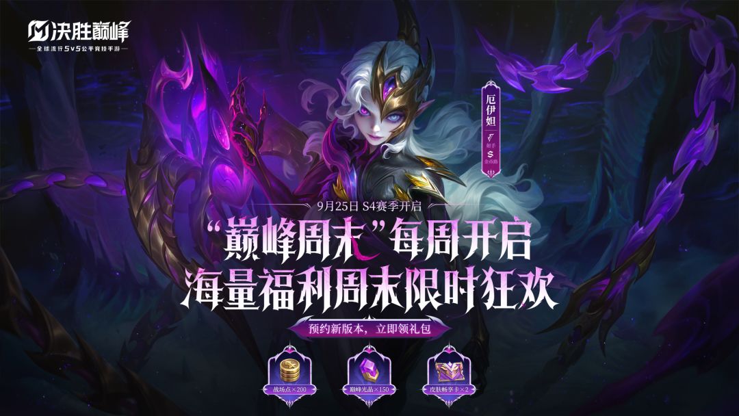 决胜巅峰S4新赛季「深渊之主」即将开启,首个全球同期上线新英雄——来自深渊的刺客型射手「厄伊妲」,9月25日,旧王降临!