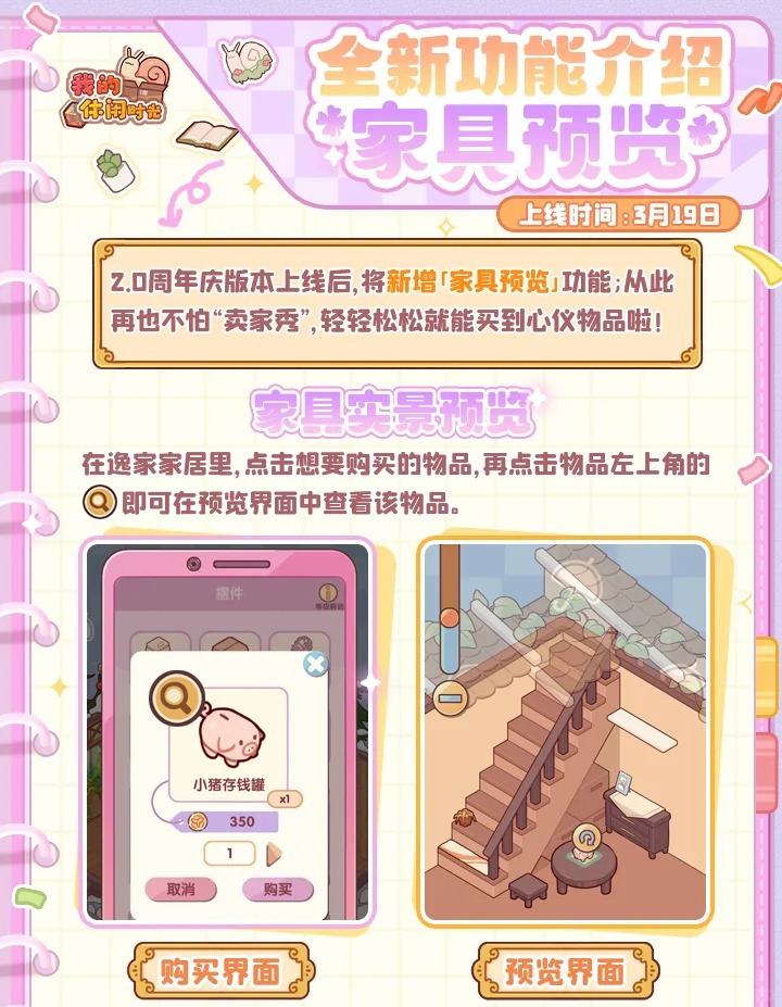 你猜怎么着?还有爆料! 居居又双叒带着周年庆版本的最新资讯来啦~~ 今天要向各位小蜗介绍的是「新增功能-家具互动按钮」&「新增玩法-花园外观装修」,快来一起看看吧! 🌱居居小Tips:新增功能将在3月19日停服维护结束后上线 周年庆版本的新内容、新玩法说了不少,又怎么会少得了最重要的「周年庆福利」呢? 🌈周年庆福利即将解锁!更有周年庆限定联动套间、全新活动玩法等内容等着大家,还请各位小蜗多多关注居