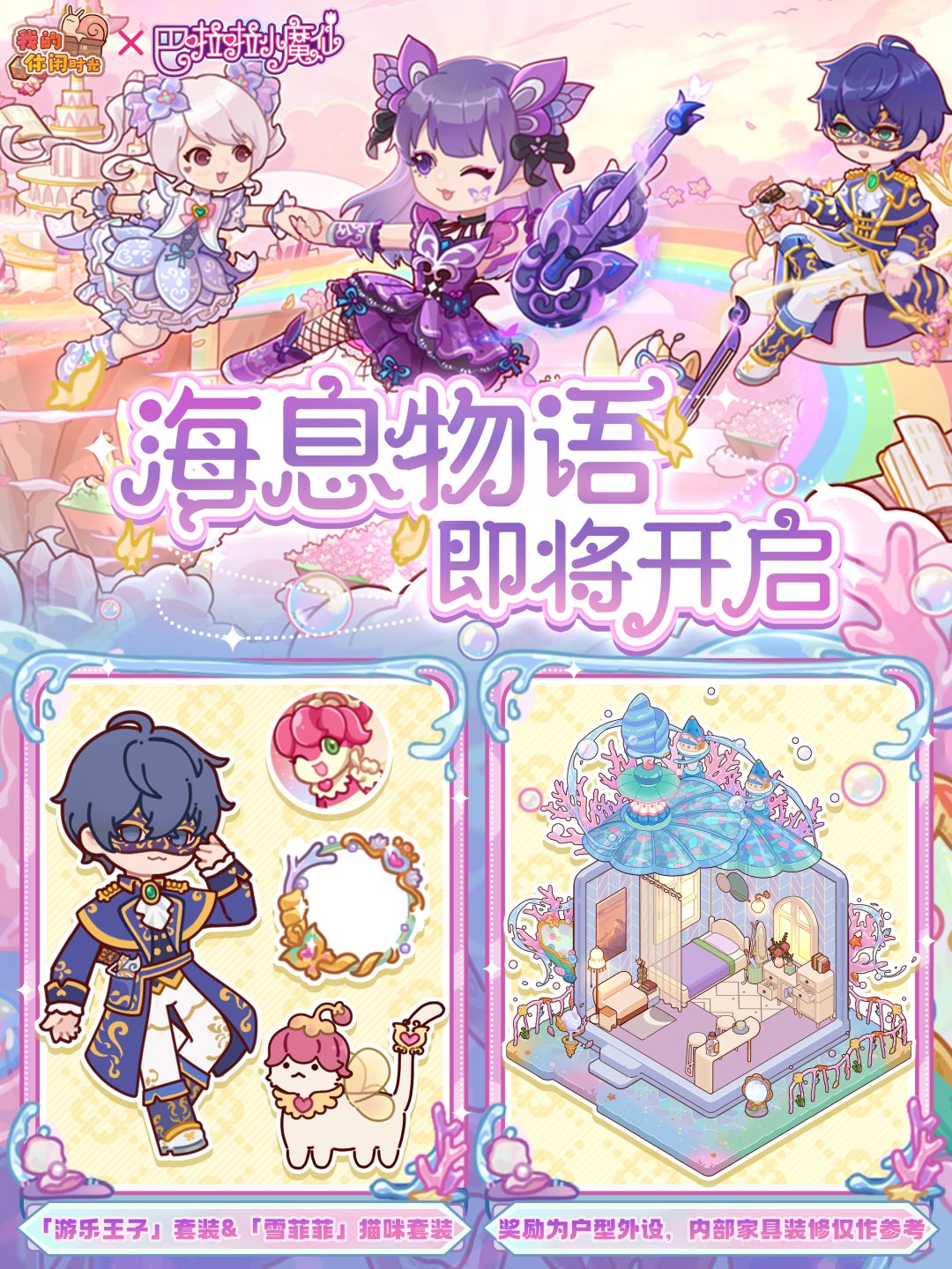 ✨古他娜!魔动枪! 「海息物语」即将于3月22日(明日)开启!做王子要有做王子的样子! ⭐️活动时间⭐️ 3月22日10:00-4月20日23:59 ⭐️活动形式⭐️ 活动期间,完成「海息物语」任务,积累任务点数,即可免费获得丰富奖励!激活后,还可解锁高级奖励、「游乐王子」套装、「雪菲菲」猫咪套装、以及限定栅栏、屋顶、邮箱外饰等奖励哟! ⭐️套装特色⭐️ 穿齐全套「游乐王子」套装还能触发特殊套装动