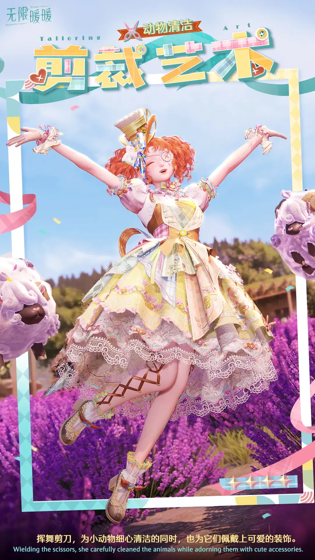 >>服装主属性·甜美 ✂套装能力「靓装裁缝·动物清洁」: 挥舞剪刀,为小动物细心清洁的同时,也为它们佩戴上可爱的装饰。 *使用「靓装裁缝·动物清洁」能力清洁小动物,可以直接跳过清洁动画哦! —— 无论何时都要盛装登场! 《无限暖暖》1.4版本「妄想季」3月26日全球同步开启! ➤前往下载: