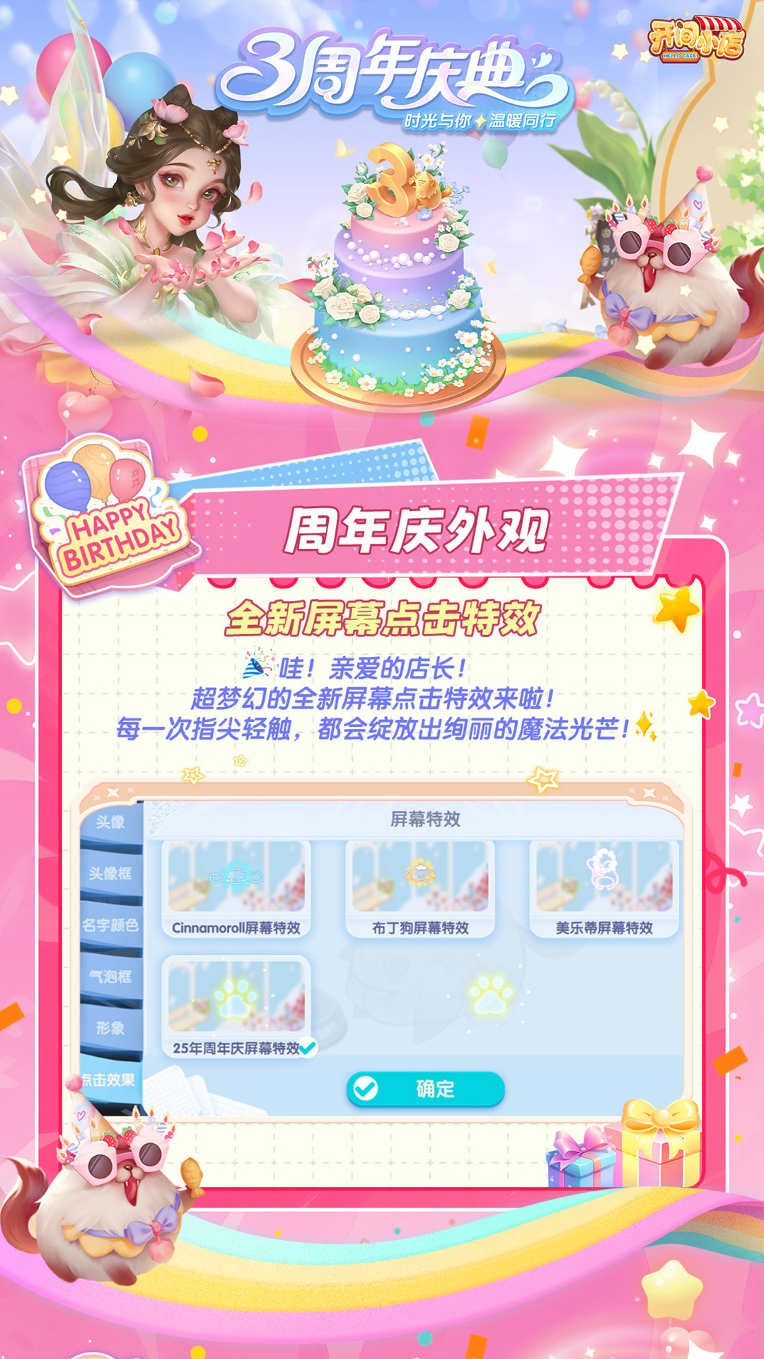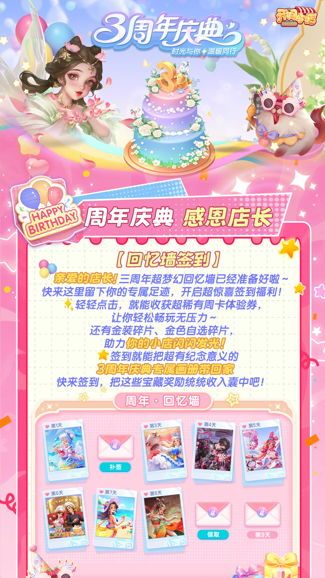 🎉救命!《开间小店》三周年狂欢派对直接嗨到爆! 长图炸场!敬请阅览!店长们快冲!! 🎈这三年就像一场超甜的经营冒险,感谢各位店长一路相伴~ 这次庆典直接放大招🔥,超帅气的凯撒带着海量福利“暴风来袭”! 全新玩法让人眼前一亮,体验周卡直接送,还有惊喜礼包拿到手软!🎁 🌸绝美周年外观更是颜值天花板,无论是清新花廊还是梦幻小屋,随便一摆,小店秒变童话世界✨从美味小食到暖心甜品,每一口都是我们满满的爱~快