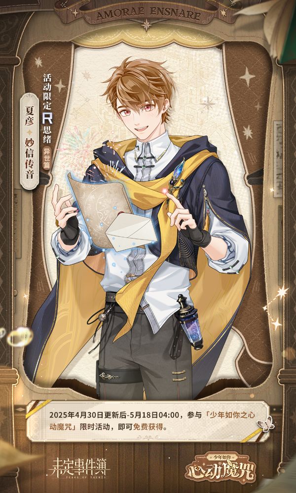 进入术法世界,施展心动魔法。 4月30日更新后,校园主题活动「少年如你之心动魔咒」开放! ✨精彩活动上线 缤纷福利派送 -完成「术院玄礼」限时签到活动,可累计获得【女神之泪·限时】×10 -累计收集指定数量【寻光沙漏】即可获得夏彦R思绪【妙信传音】、左然R思绪【书灵戏法】、莫弈R思绪【奇药幻语】、陆景和R思绪【美味秘术】,及以上思绪的思绪残影 -累计收集指定数量【寻光沙漏】即可获得活动限定遇见邀请