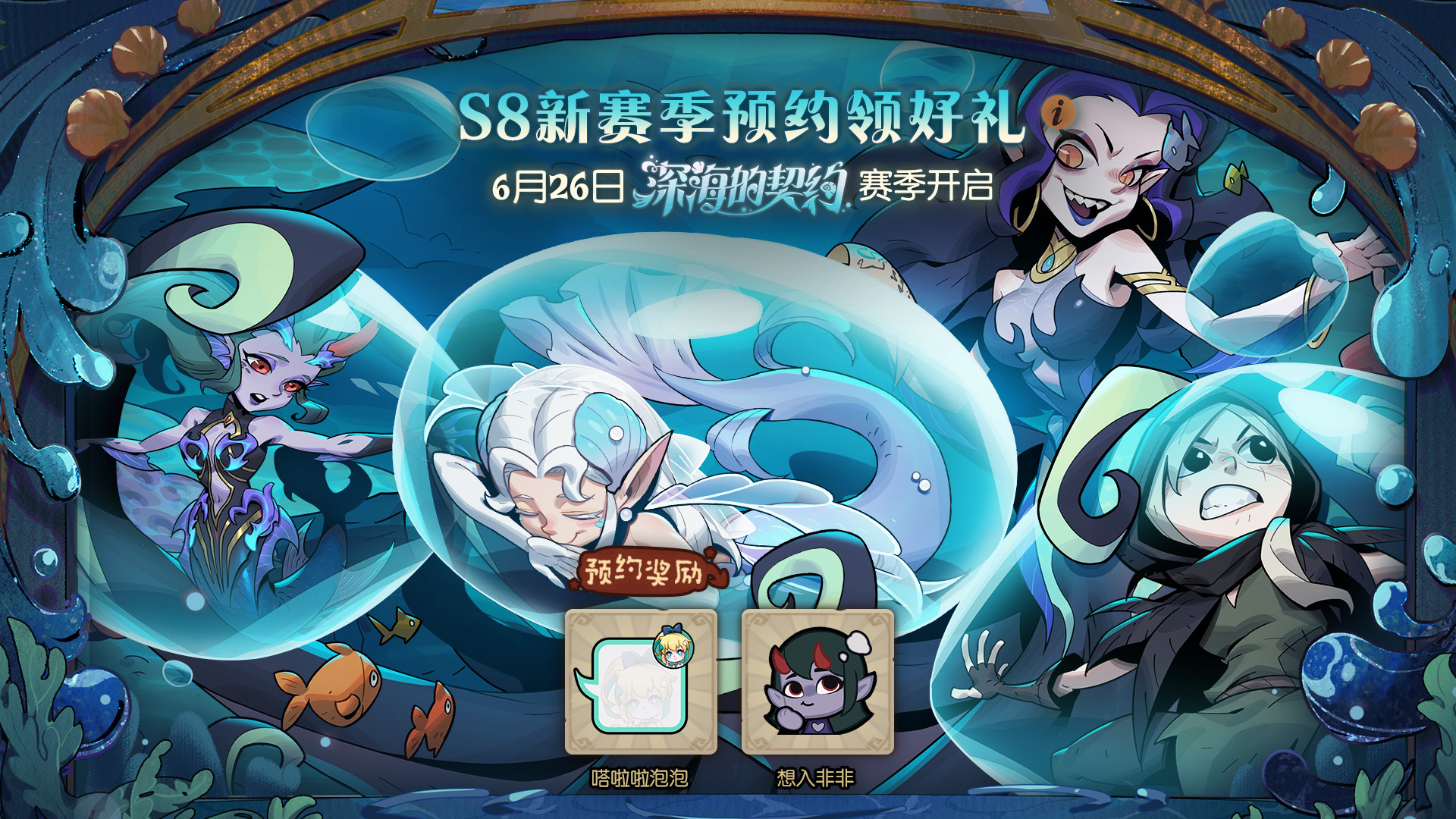 这个夏天,忘掉现实,纵身跃入深海的怀抱吧!《月圆之夜》镜中对决S8赛季——「深海的契约」 6月26日即将开启!阳光、沙滩与人鱼的哀歌已为你铺就通往深海的道路,而那位藏于暗潮之下的海洋女巫,正手握契约等待你的抉择…… 预约有奖:全新S8赛季:【深海的契约】将于6月26日上线,丰厚预约奖励等你来拿 预约满1W人:嗒啦啦泡泡*5(聊天框气泡) 预约满2W人:想入非非(表情) *该批次兑换码全渠道通用,不