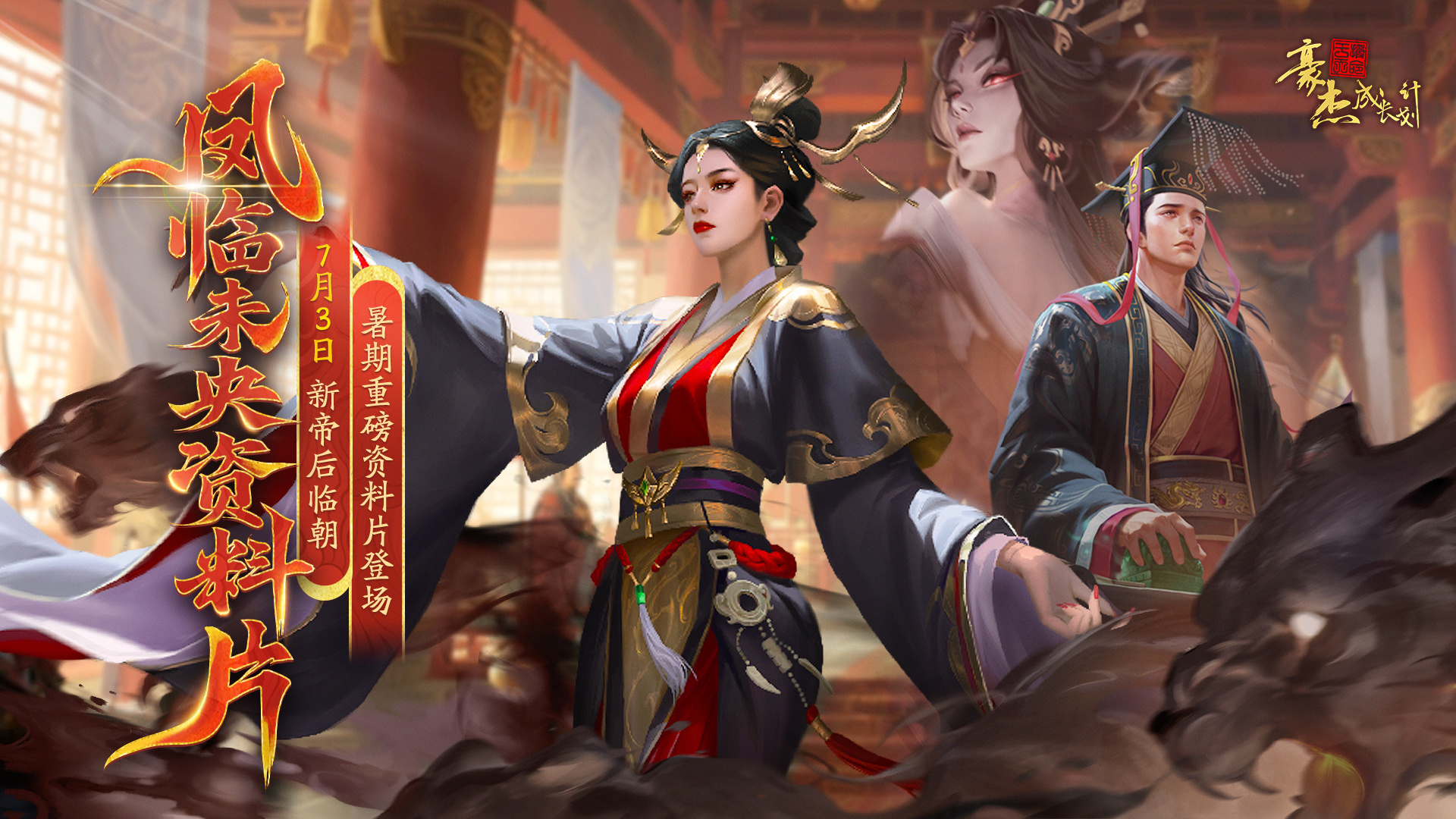 老爷们好~秋·情报·香登场!新资料片速递来咯! 金冠翠钿映丹唇,眉底藏锋不动尘。 豪杰成长计划,汉朝「凤临未央」资料片即将开启! 不止有暑期多重惊喜活动,更有新角色、新典藏金卡登场,就是......唔——秋香又被“封口”啦~ < 更新时间 > 2025年7月3日 < 主要内容 > 「汉朝」新本纪、新拓展包正式登场啦 首位帝后“吕雉”临朝,全新典藏金卡上线! 新增往期副本爬塔玩法,挑战武侠全副本! 全