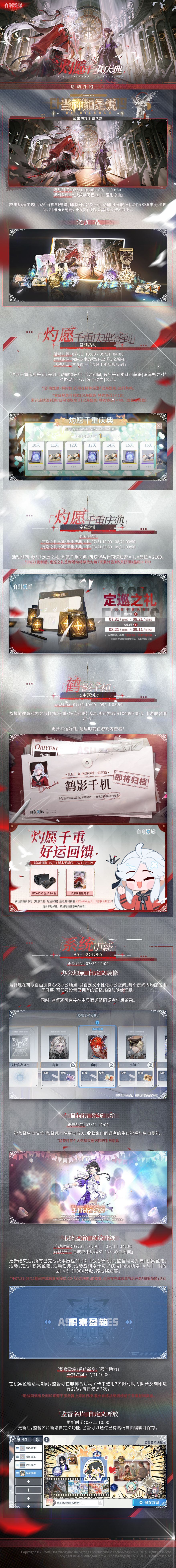 ▶限时故事历程主题活动:「当祢如是说」即将开启 ▶签到赠礼活动:「灼愿千重庆典·签到」、「定巡之礼·灼愿千重庆典」即将开启 ▶「裁梦刀」、「岁暮重明」定向共鸣即将开启 ▶「局外人」、「洗出汪外」定向潜航即将开启 ▶系统更新:办公地点自定义装修、生日祝福、监督名片自定义 即将上线 ▶系统升级:「积案盈箱」活动即将开启,系统新增「限时助力」 ▶H5活动:「鹤影千机」、「灼愿千重,好运回馈」主题活动即将