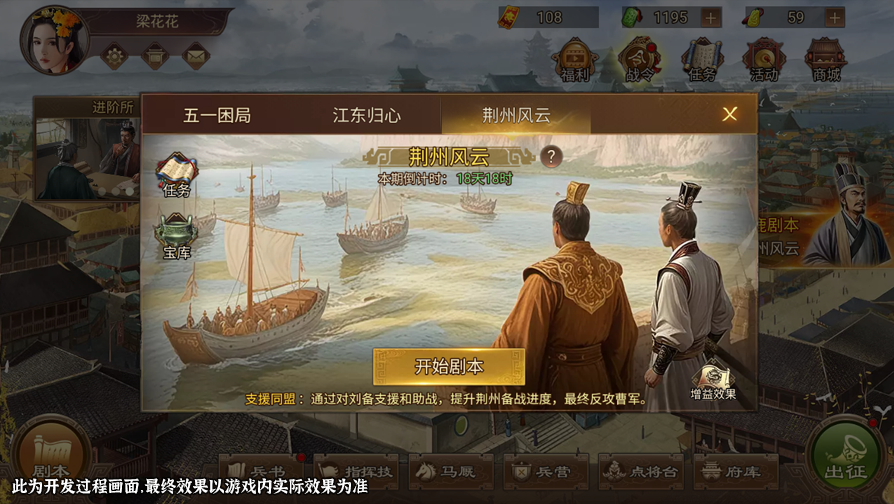 公元200年,曹操于官渡大破袁绍,奠定统一北方之势。刘备兵败后率残部南下,投奔荆州牧刘表。刘表全力整合荆州内部,并将荆州北大门新野的防务托付于刘备,以防曹军南下。北方的曹操虽暂时无暇南顾,却始终虎视荆襄。一场更大的风暴,正在悄然酝酿。 全新逐鹿剧本『荆州风云』即将上线,本次剧本以 提升备战进度 作为第一要务,下面为大家简单介绍一下。 注意:本文内所有爆料内容均来源于开发版本,实际效果请以线上效果为