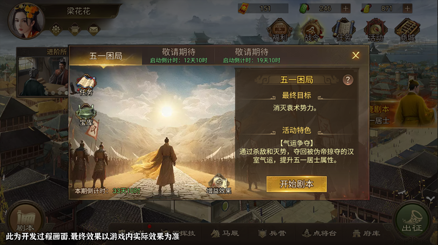 为了给各位主公带来更丰富的游玩体验,部分经典剧本将迎来重大改版升级。本次更新后,原“征战剧本”中的“五一困局”,将作为首个搭载全新玩法的【逐鹿剧本】重装上阵,开启策略新篇章! 主公们可通过治所内剧本提示框或开始新剧本来进入对应逐鹿剧本,下面为大家介绍一下具体的设定与玩法。 注意:本文内所有爆料内容均来源于开发版本,实际效果请以线上效果为准。 剧本设定 【逐鹿剧本】包含以下特殊设定: ● 增益效果:
