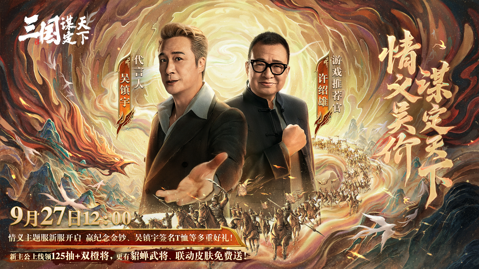 烽火燎三谋,情义定天下!9月27日起,吴镇宇代言系列新服开启,共夺霸业金钞豪礼!《火凤燎原》动画联动开启,“小孟”貂蝉精美联动外观免费领!