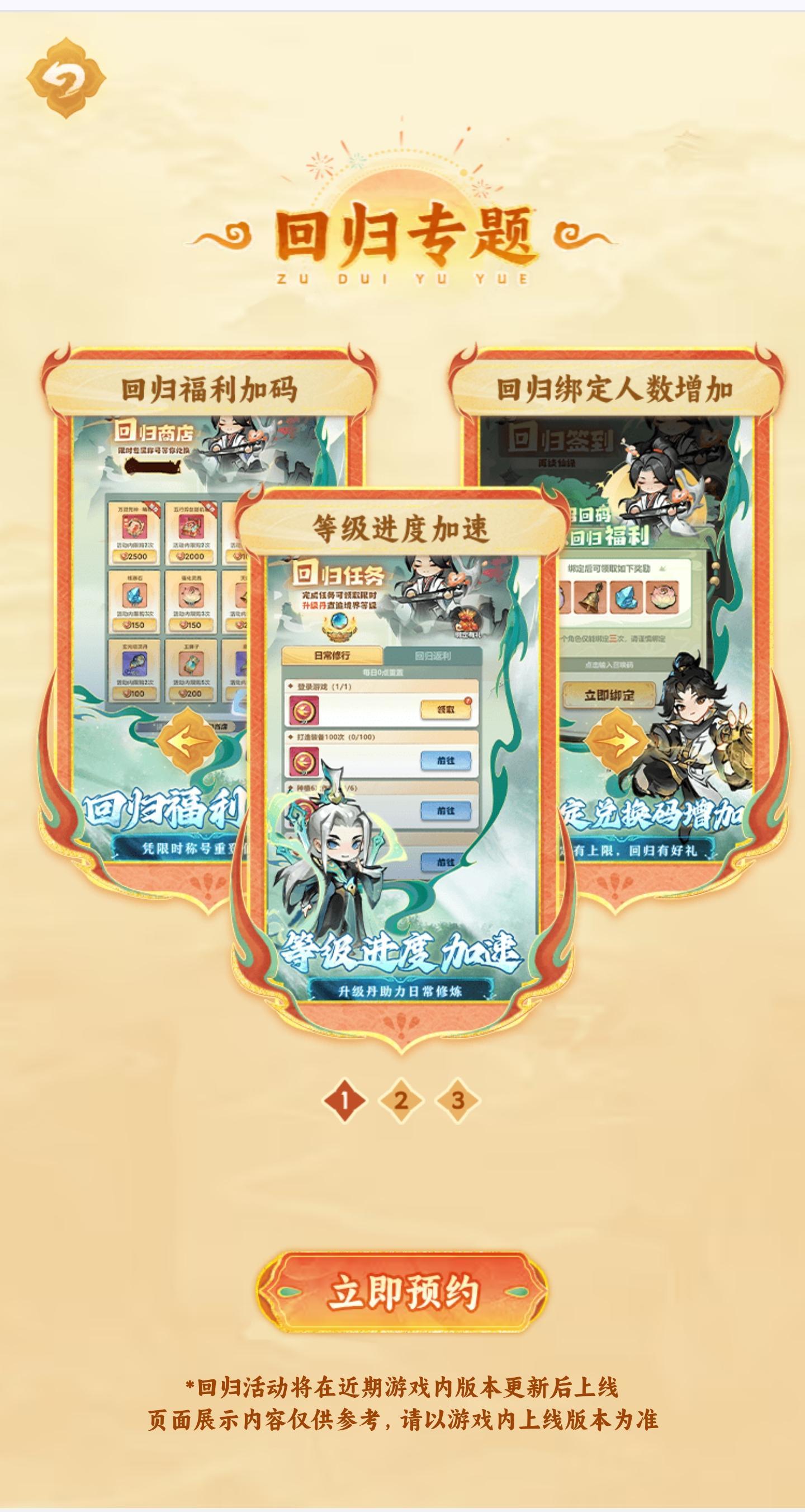 3 赞《主宰世界》周年庆典火热进行中! 在即将到来的周年版本期间 登录签到、限定抽奖等七大福利活动连番登场 更有三重回归专属福利助你重登仙途! 快来扫码预约,组队参与活动 第一时间获取上线通知,觅得珍贵修仙机缘! 召集回归道友,更有机会获得额外惊喜好礼~ 【扫码预约,组队回归👇】 活动日历 周年&回归专题 周年版本福利放送爆料 【庆典献礼·登录即领】 核心奖励:圣品法宝【感谢有你】、永久时装【盛典礼服】