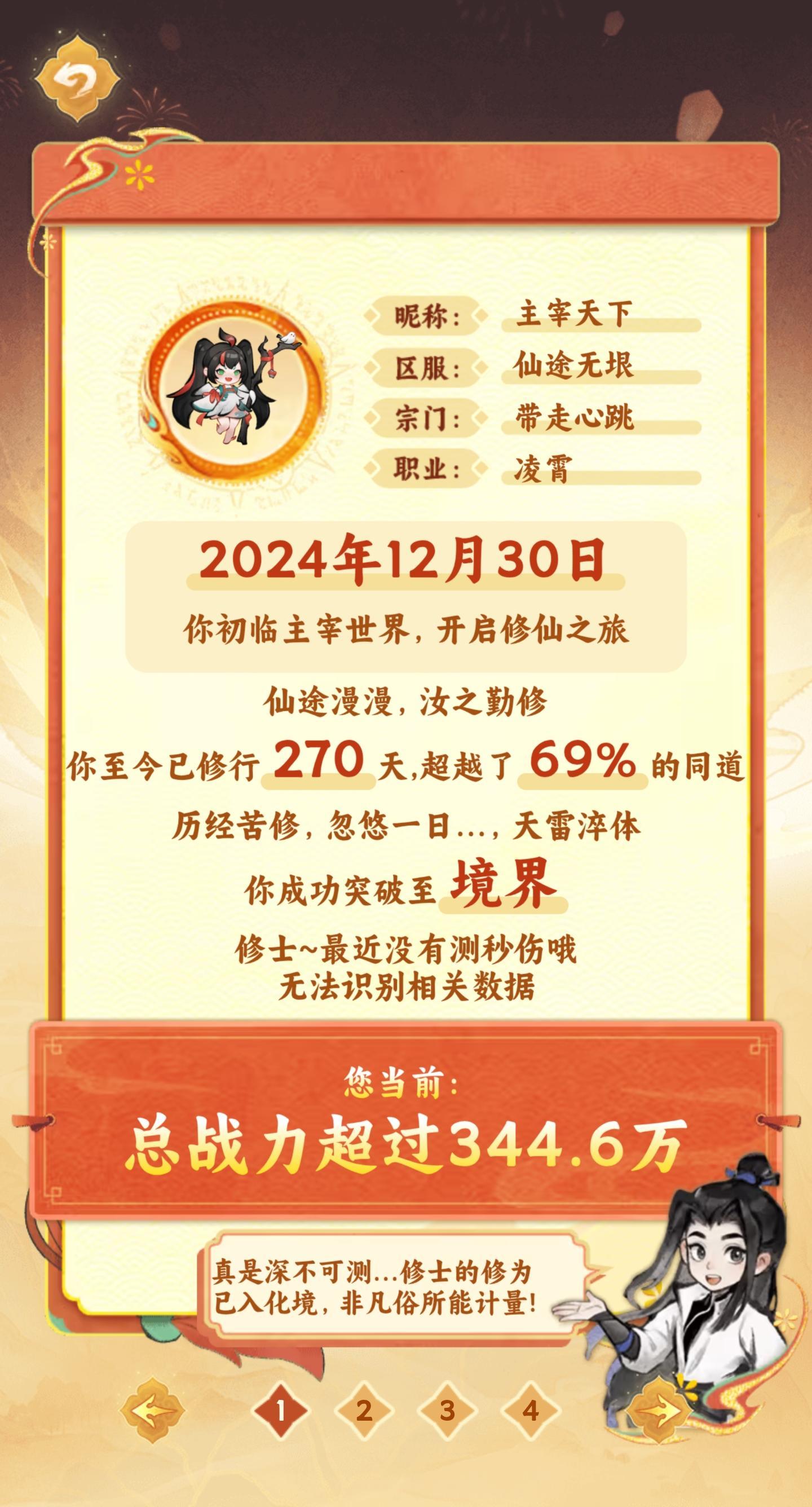 2 赞星辰轮转,仙途漫漫 转眼间,主宰世界已陪伴诸位修士共度一载春秋 亲爱的修士们,周年庆典的修仙报告今日正式开启 这里不仅记录了你初次降临主宰世界的时间 还会展示你的境界成长、总战力、近期战斗表现 以及灵田收获与好友互动数据 这是属于每一位修士的修炼足迹 也是对这一年修仙旅程的特别纪念 瑶儿已经迫不及待想听到各位修士的分享 即日起至9月30日 晒出你的【修仙报告】截图 【👇扫码参与活动】 参与方式 ①