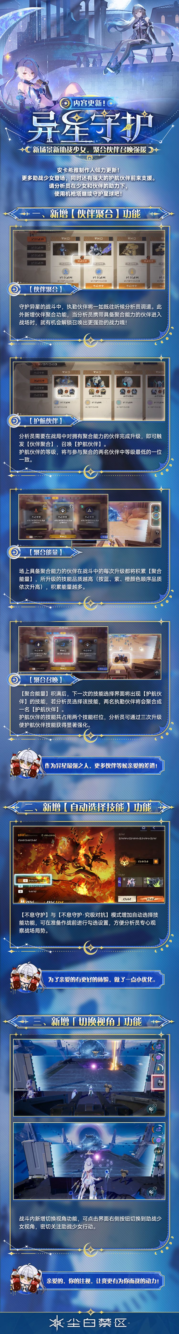 恒约后的安卡希雅与茉莉安将在【异星守护】中,作为分析员的助战少女上阵!还有【伙伴聚合】功能,可为分析员召唤出更强力的护航伙伴。快来全新战斗场景中,与少女们爽快战斗吧~ 官方Q群:868421507