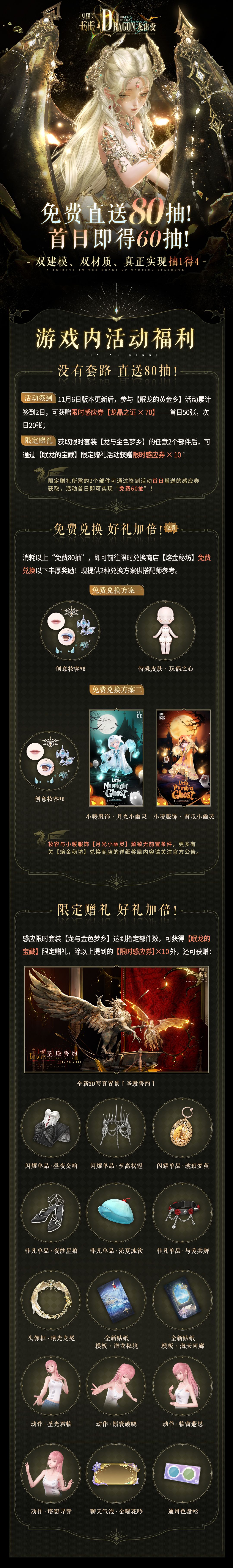 ⭐11月6日更新后,新意节特别活动【眠龙的黄金乡】限时开启! ⭐双建模、双材质,免费直送80抽,首日即得60抽~ 活动时间&兑换时间:11月6日更新后-11月19日23:59 ✨【活动一】登录签到·免费70抽&海量福利轻松领 1.活动期间每日登录即可领取奖励,首日签到即得限时感应道具「龙晶之证」×50、次日可得「龙晶之证」×20,累计70抽! 2.累计签到还可获取粉钻×230、服饰单品等奖励。 ✨