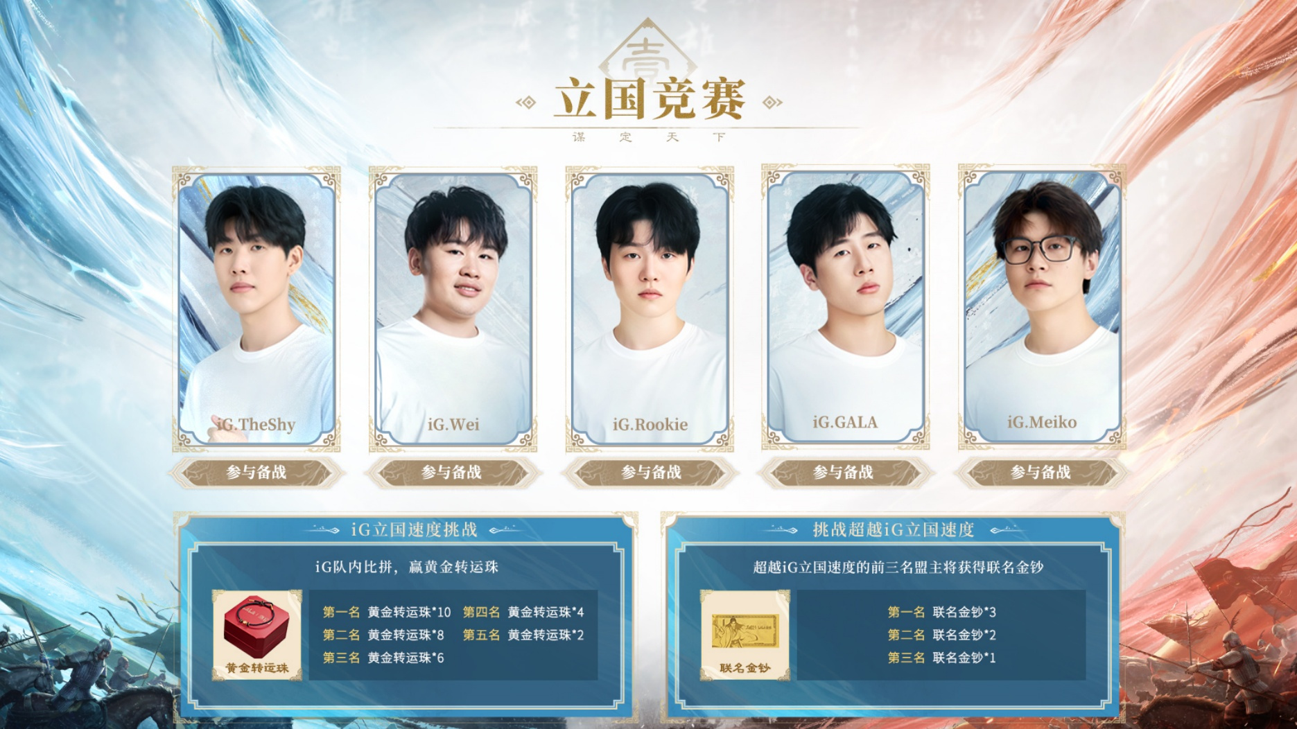 iG战队集结三谋,开启联动主题服!立国竞速、同盟霸业等海量活动开启,黄金转运珠、联名金钞、亲签周边等你赢。11月22日,和明星选手一齐征战!