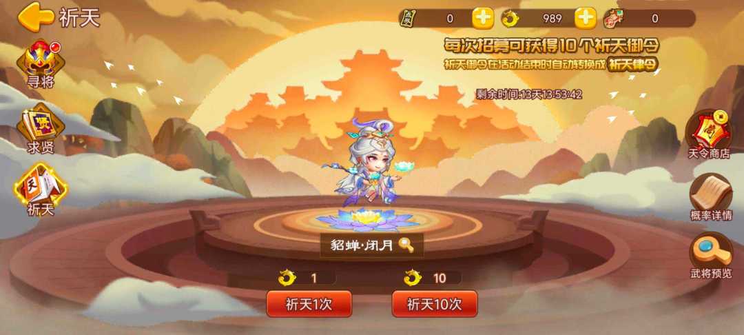 注:所有活动需更新至5.0.00及以上版本才能参加,请玩家及时更新最新版本,具体活动内容以游戏内为准。 【活动1:祈天招募】 活动时间:2026年1月30日10点 - 2026年2月12日23点 活动内容:活动期间开启祈天招募,使用玉龙玦祈天概率招募神话武将。玉龙玦可在征召商店和特惠商城购买,或者参与运营活动获得。 本期祈天神将:貂蝉·闭月 【活动2:累计祈天】 活动时间:2026年1月30日10