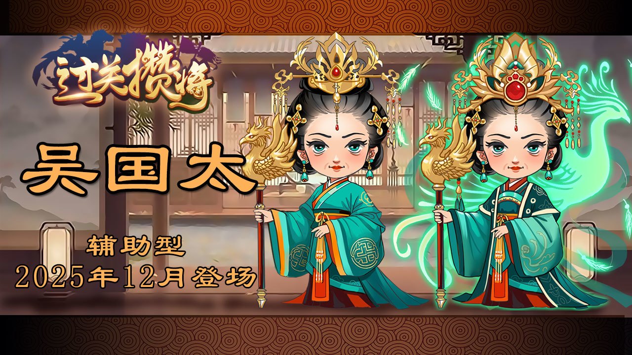 辅助型武将“吴国太”即将在《过关攒将》5.17.0版本(预计25年11月底发布)中登场。 孙坚次妻,孙尚香之母,她在甘露寺相亲中认可刘备,促成孙刘联姻。孙权欲夺回荆州时,吴国太以女儿安危为由阻止其发兵。后孙尚香借吴国太病重之机返回东吴,最终与其重聚 。 基础兵力300,孙坚、孙策、孙权下视为"本国", 神将满级技能效果(未突破,最终数值可能有出入) 「辅君」:本方「主公技」紫数值+21%(若为