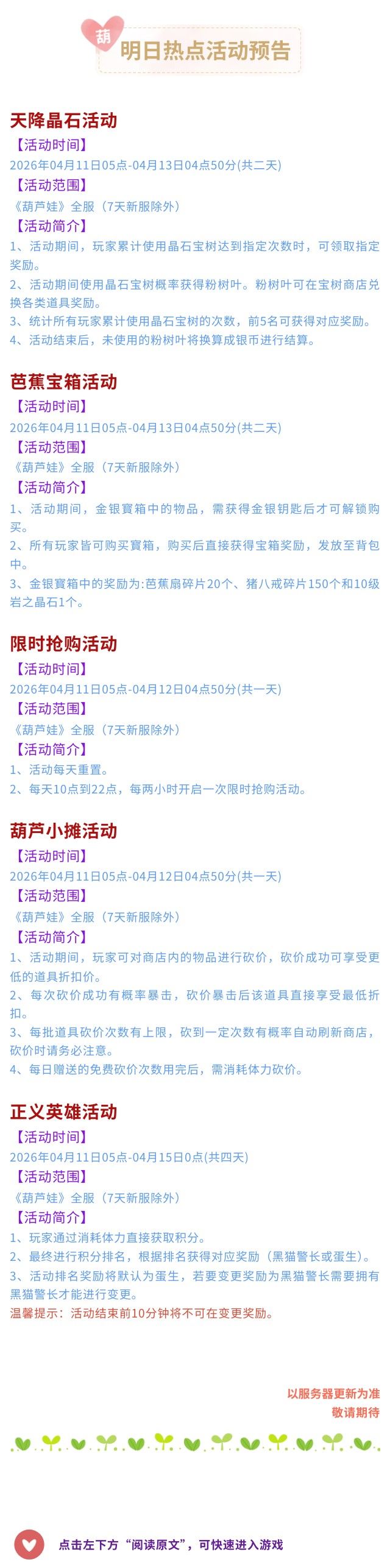 【葫芦娃】4月10日活动预告