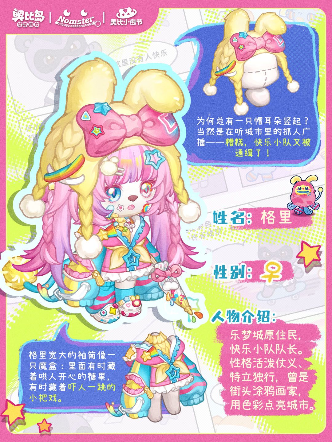🌑当阴郁笼罩乐梦城,当情绪被规则禁锢,Nomster快乐小队破界而来!一起奔赴一场驱散阴霾、点亮城市的冒险之旅。 📑下面为大家播报快乐小队成员信息! 格里:快乐小队队长,以鲜活色彩点亮城市,用热情带队冲破阴郁 🌈汉克:小队的坚实后盾,冷面心暖,默默守护每一份快乐 🌊凸凸:梦魇终结者,剪断梦里所有不安 ✂️呐咘:快乐信号发射器,满格能量,把治愈电波传遍城市角落🎮 ✨️4月10日,奥比岛XNoms