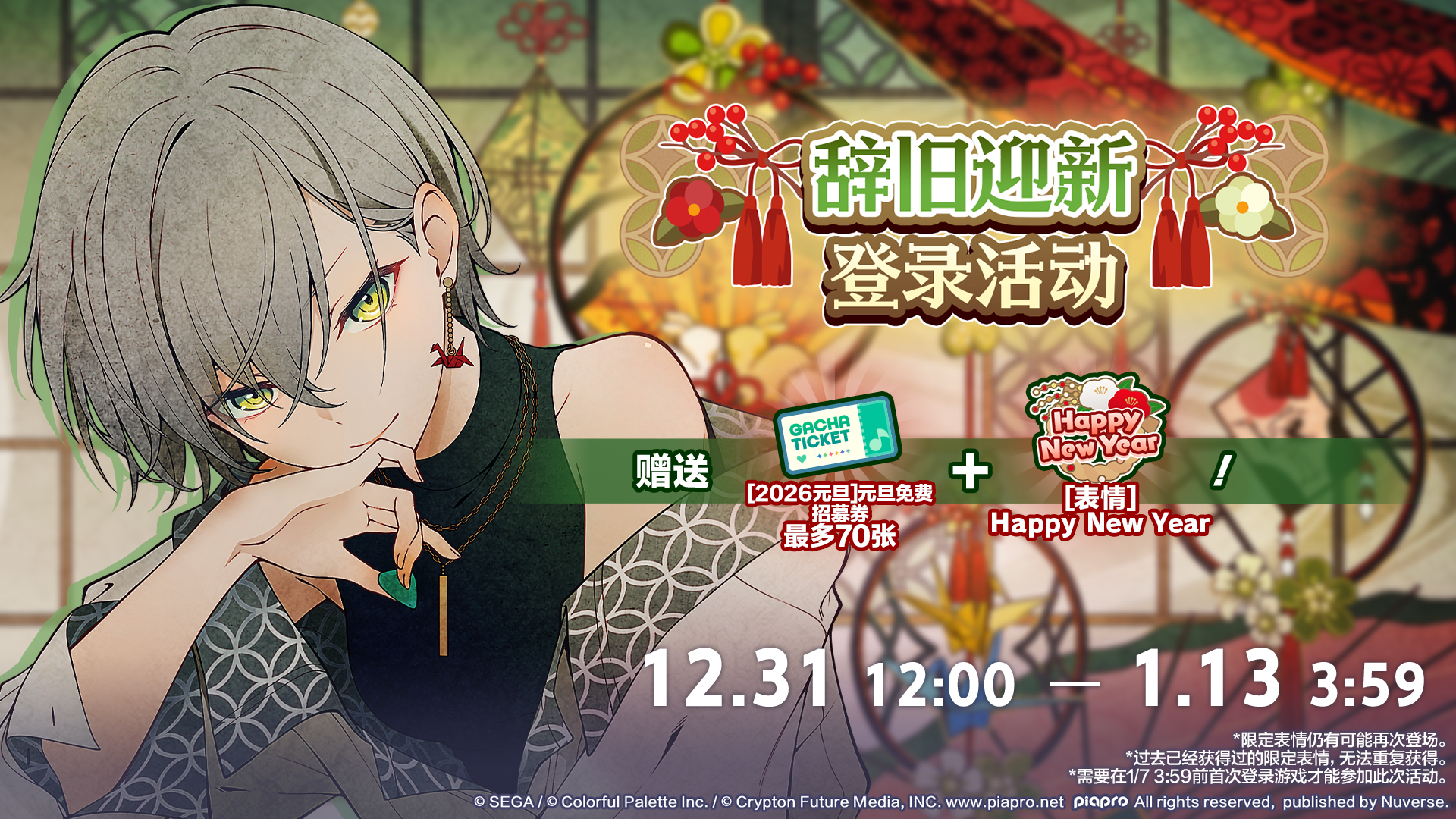 尊敬的各位「世界」居民: 感谢各位居民对《初音未来:缤纷舞台》的支持。 为庆祝新年即将到来,我们将于12/31 12:00起举办辞旧迎新登录活动。 怀抱着感谢之意,我们将在活动期间为所有登录游戏的居民送上最多[2026元旦]元旦免费招募券×70! 活动期间前七日登录游戏,每日都可领取[2026元旦]元旦免费招募券×10;首日登录还可额外获得[表情] Happy New Year!请不要忘记登录领取