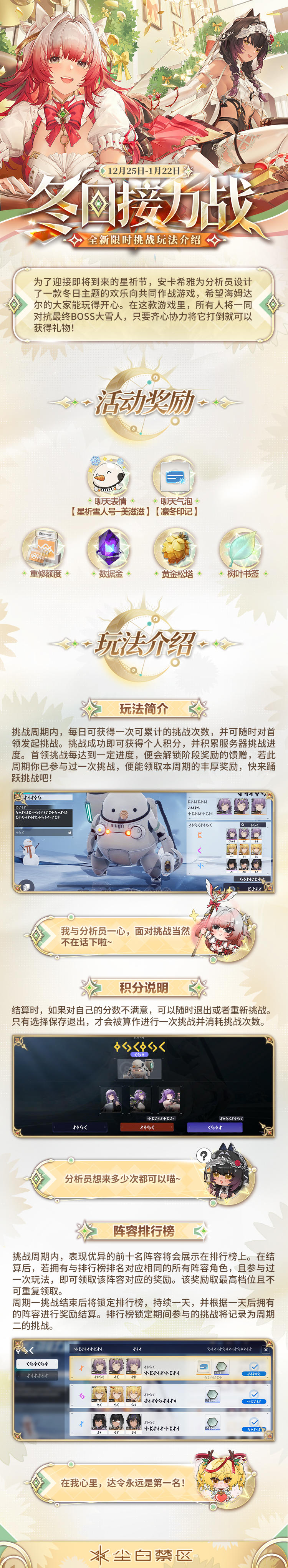 欢乐向共同作战玩法【冬日接力战】即将开放体验!在雪地场景中携手作战、对抗趣味BOSS大雪人,还可收获星祈节的特别礼物~愿分析员与海姆达尔的大家共度美好时光! 官方Q群:868421507