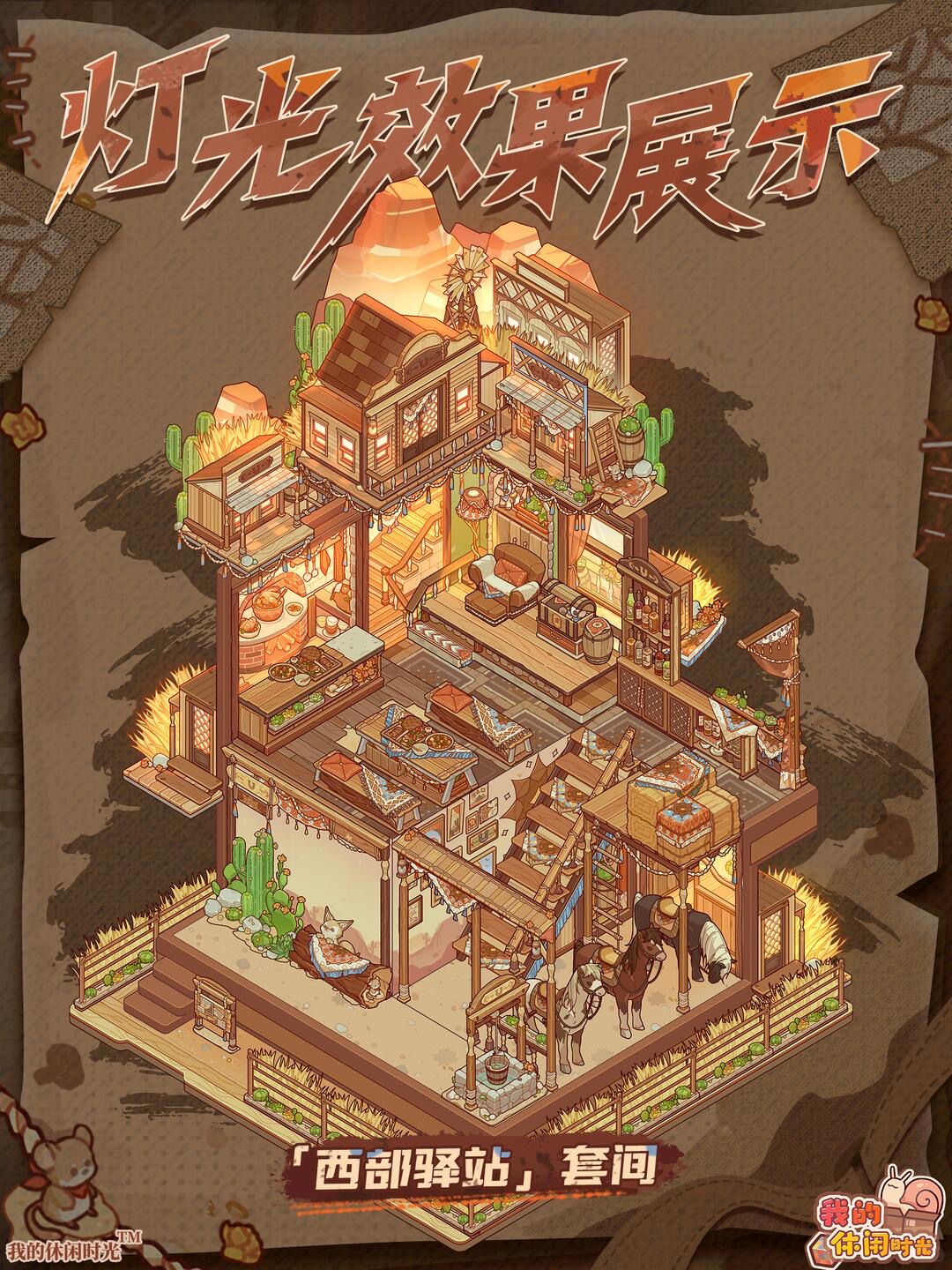 ⭐️设计关键词:西部风、异域 顶着烈阳,跨越沙丘,年轻的冒险者纵马驰骋着,终于在落日前到达这座传闻中的驿站:原木建造的房屋在风沙中纹丝不动,马儿们在马厩中静静休憩着; 踩着吱呀作响的木楼梯走上二楼,迎面便是喷香的烧肉味与众人的笑闹声,这是驿站每日都在上演的庆典,庆祝大家的初次见面,以及再次度过充满刺激与冒险的今天。 🏜️全新限时星耀套间「西部驿站」即将于12月19日上线!今天先为各位小蜗带来「西部