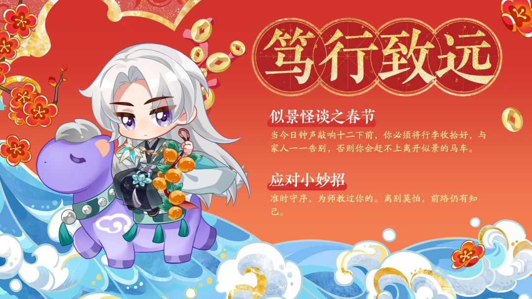 误入似景,结交名士。识别规则,寻路返乡。这一路的麻辣鲜香想必只有学子自己能体会~ 子叶在此恭喜学子们,即将成功在似景世界度过春节!今夜之后便可踏上归途。 是归程,亦是新故事的启程。 💌温馨提示:今日登录游戏,可收到名士的新年来信~