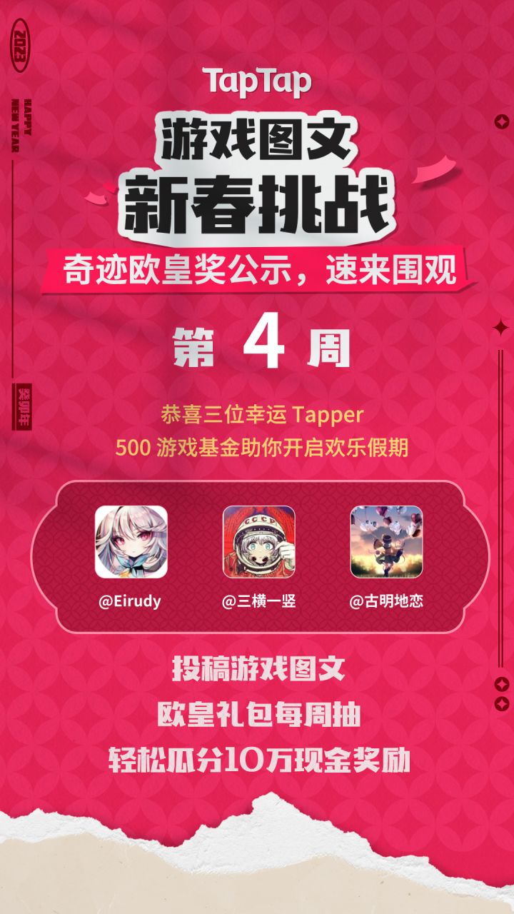 游戏图文新春挑战最后一份「奇迹欧皇奖」公布!恭喜以下 Tapper 获得500元奖励:Eirudy(10238132)、三横一竖(448150605)、古明地恋(多多良小伞)(433615648)本次活动到此结束,感谢大家的一路支持 〃∀〃 请获奖 Tapper 最晚于2月20日进入“收货地址”https://accounts.taptap.cn/personal-info的【收件人地址