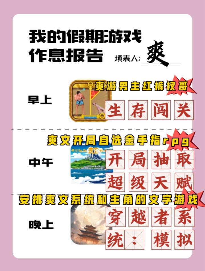 “你是否想过,当年广告里红裤衩哥的艰辛”“你是否想过,超级金手指主角也可以是你”“你是否想过,安排系统和主角的幕后黑手”如今,这三个想法,一次打包!游戏名:《生存闯关》推荐指数:★★★★☆《开局抽取超级天赋》推荐指数:★★★☆☆《穿越者系统:模拟》推荐指数:★★★☆☆非割草换皮的爽游〖单机〗〖耐玩〗〖非割草〗〖小众好玩〗〖爽文〗〖冒险〗〖有系