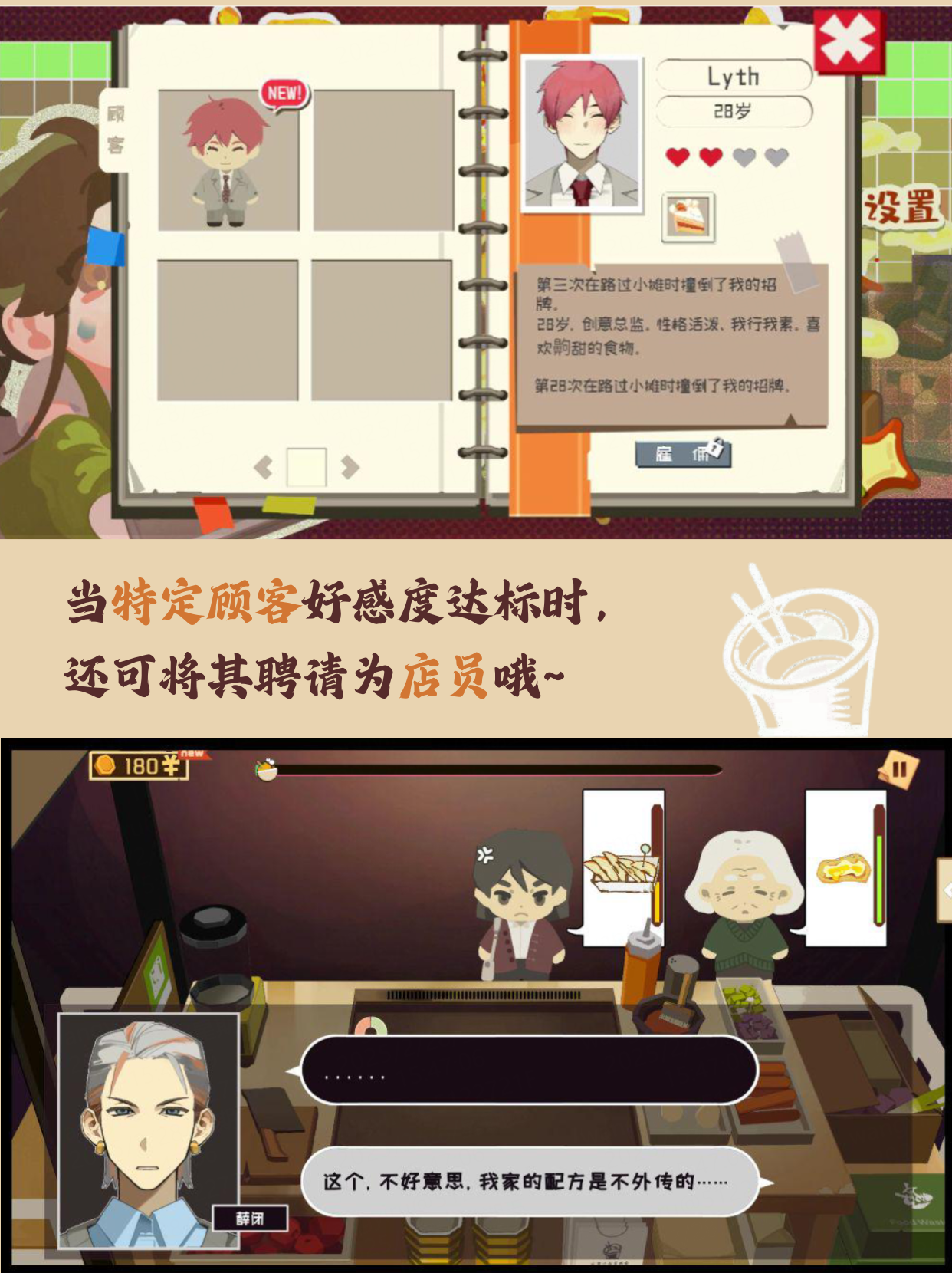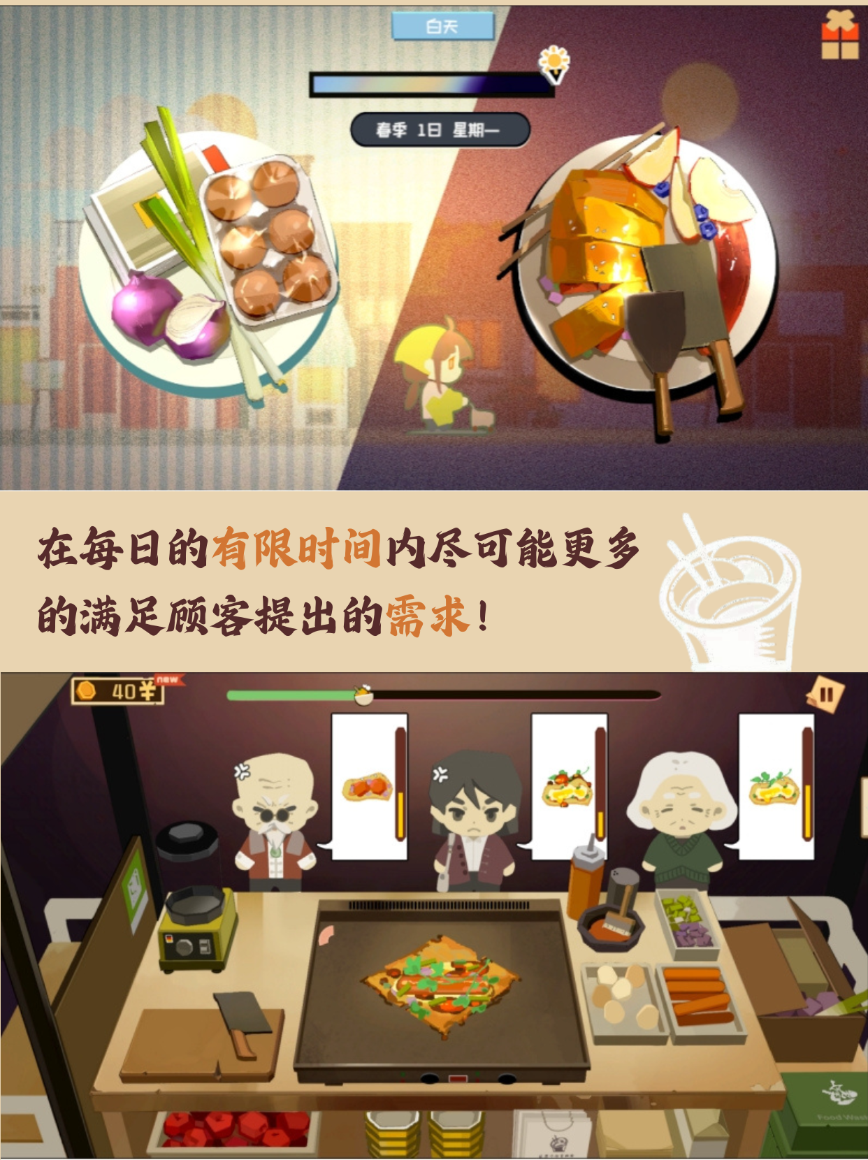 最近晚上在公司附近总是能看到一个卖小吃的小摊,玩家将扮演小摊摊主。玩家的摊位上陈列着制作烤冷面和其他小吃的食材,在每日的有限时间内尽可能更多的满足顾客提出的需求。在经营小摊的同时,玩家可以开发出各类美食菜品,邂逅更多美食奇遇。然而,经营这个摊位并非易事。除了日常的售卖工作外,玩家每周还需完成一项挑战性的任务:采购。玩家通过任务来准备食材,无论是独特的食材还是稀有的原料,都需要玩家仔细甄别,谨慎选