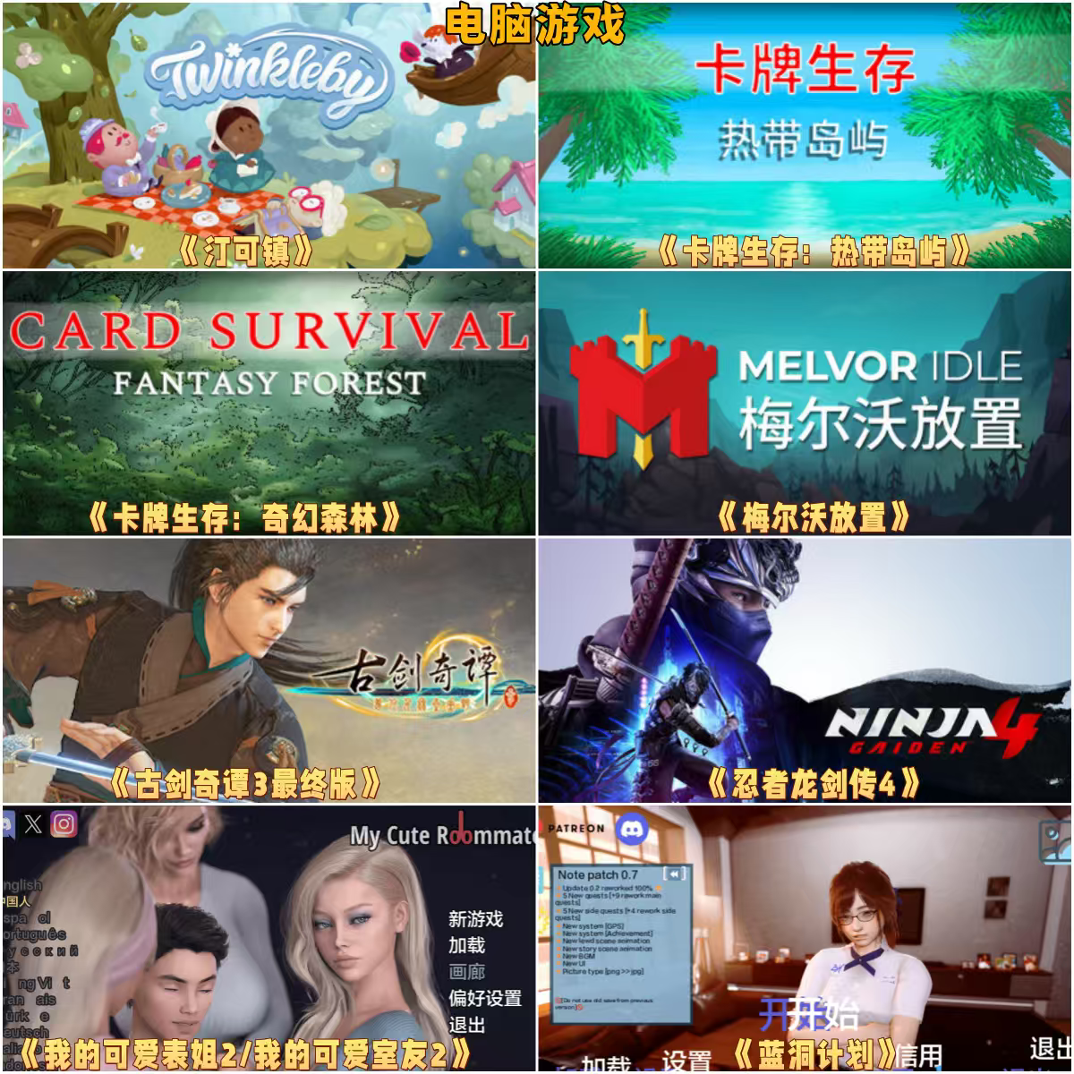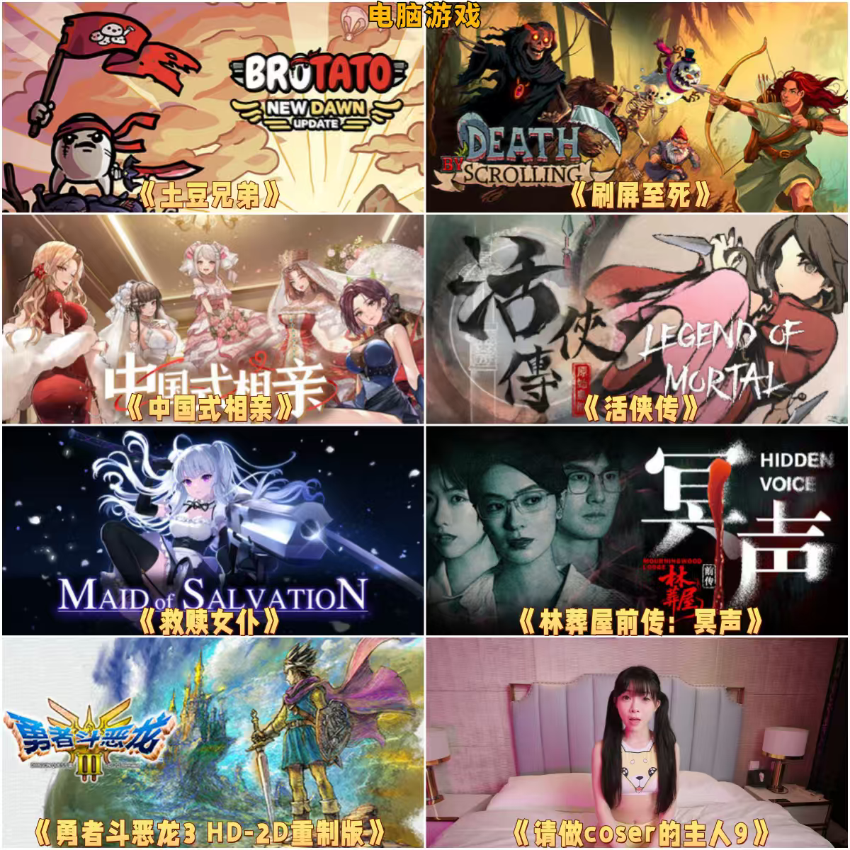 电脑端:1.《土豆兄弟》2.《刷屏至死》3.《中国式相亲》4.《活侠传》5.《救赎女仆》6.《林葬屋前传:冥声》7.《勇者斗恶龙3 HD-2D重制版》8.《请做coser的主人9》9.《汀可镇》10.《卡牌生存:热带岛屿》11.《卡牌生存:奇幻森林》12.《梅尔沃放置》13.《古剑奇谭3最终版》14.《忍者龙剑传4》手机端1.《英雄王国》2.《小小幸存者》3.《
