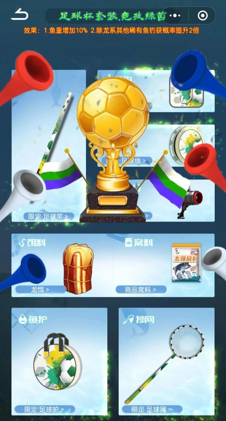嗨咯啊!各位钓友们大家好啊!我是每天给各位钓友们分享各种钓鱼小技巧的木鱼,本期内容是讨论最近新出的足球限定套装怎么可以在短时间内快速获取的,现在跟着木鱼一起来看看吧!这次足球杯限定活动要在12月25日的时间结束,而足球杯限时活动的开启是11月18日开启,不过抖音版是先在18日开启这次的足球杯限时活动,而微信版是晚几天才跟上来的。这就是微信版比较难兑换的原因了,不过想兑换到这款足球限定渔具套装的小