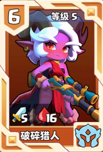 亲爱的冒险家们好呀~强力的爆发输出卡--破碎猎人已上线!今天就来给大家讲解一下这张卡应该如何使用~一、随从介绍1、属性介绍破碎猎人,种族归属--‘帝国’,待机值6,1级基础属性3|10,满级基础属性5|16。具强力输出、解大怪、拦截、光环等多功能于一身,破碎猎人绝对是张T0强卡!!!2、技能介绍技能1--重型猎枪该技能增强了破碎猎人的攻击距离,也让她对付大卡有额外加成,能够轻松解掉敌方