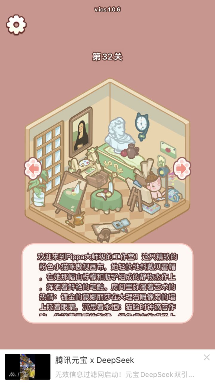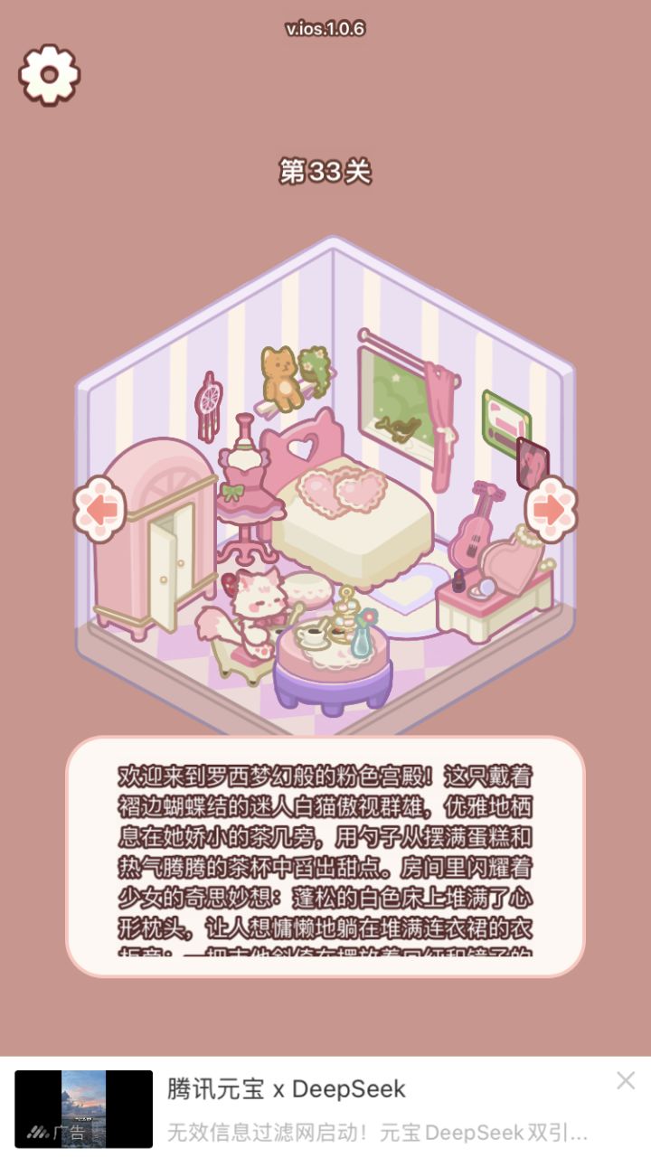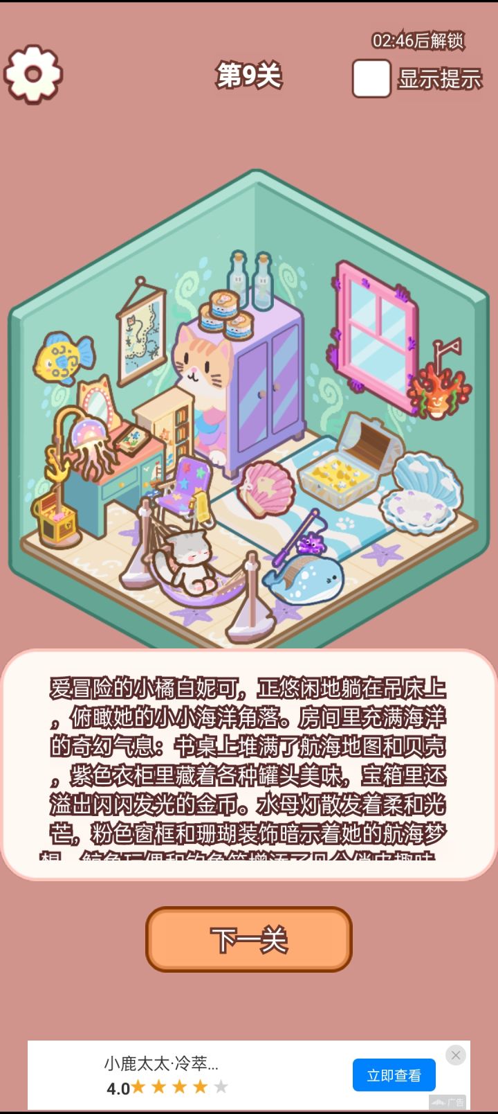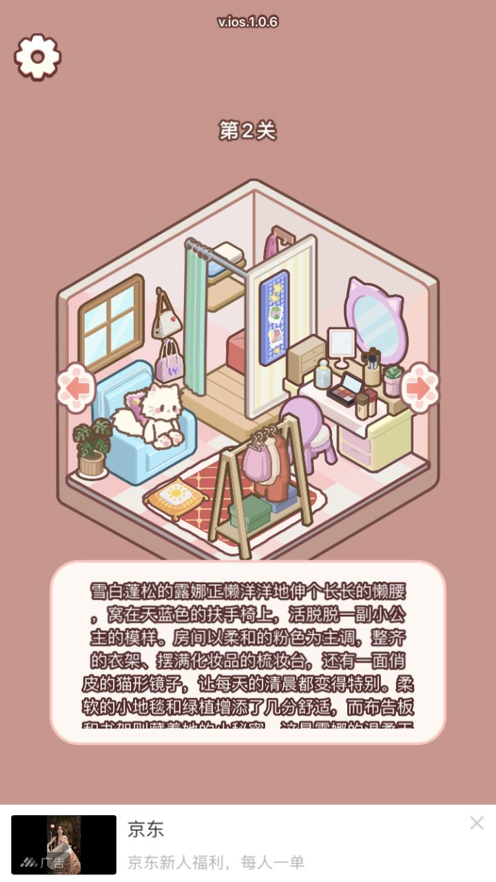 总体来说可玩性很高 但是小物件会出现已经放到本该到了的地方但是没有过去的情况 画风很好看 玩法比较单一 打发打发时间是一个很不错的选择有些物品可以不用按照常规思路去摆放遇事不决上墙试试 什么时候再多来几关