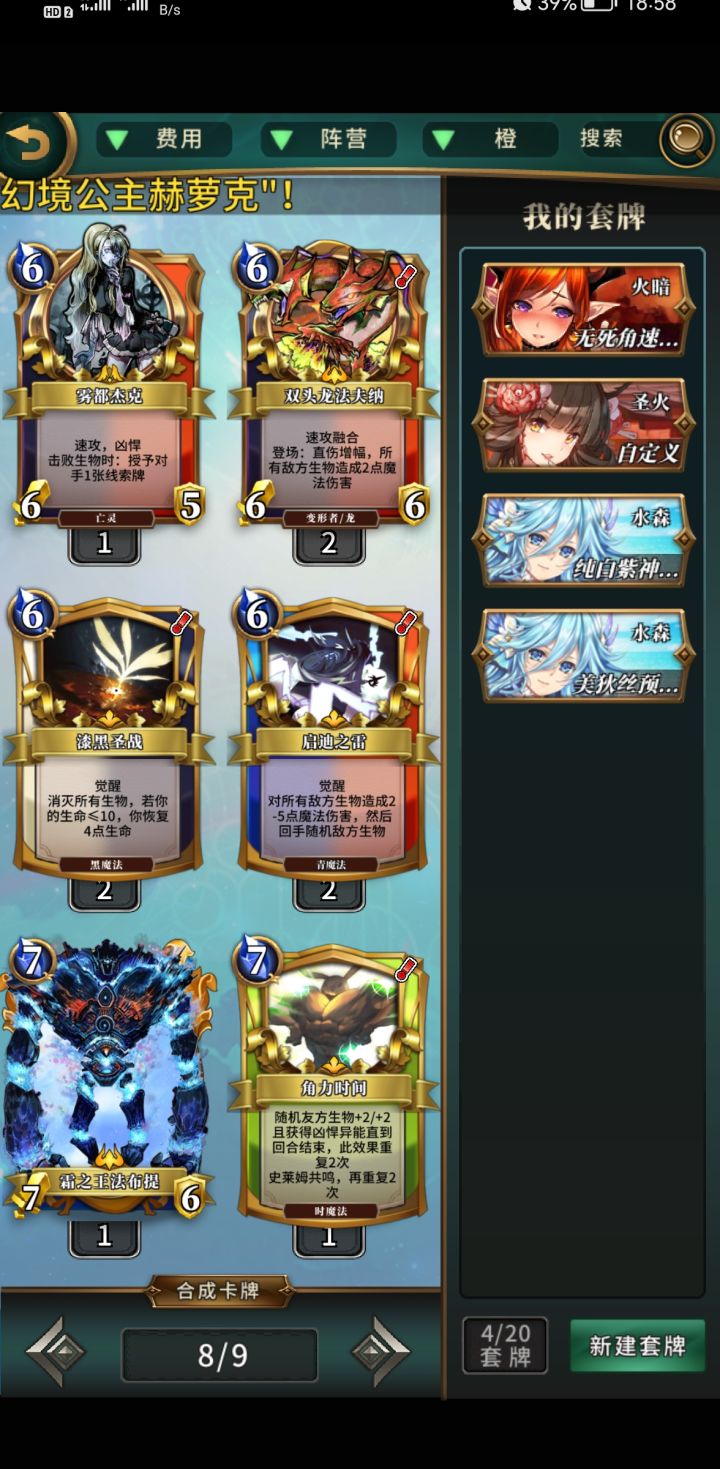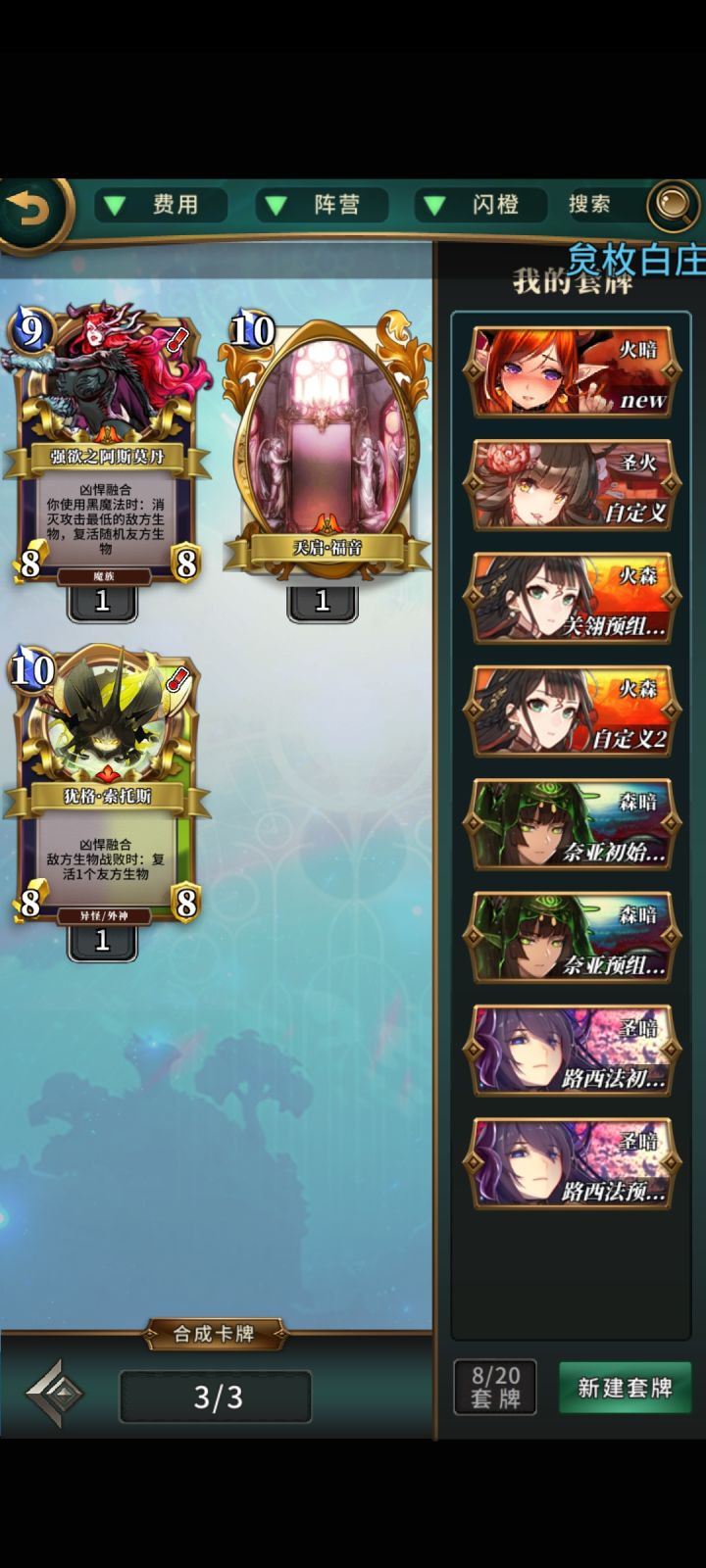 如图所示,卡组如上主要核心打法就是遵循大部分奈亚的核心奥义前期我唯唯诺诺,后期我重拳出击。1、关于低费五费之前还是能抓到几个低费卡牌的,并不需要开局贴脸糊别人脸上,反正能抗住,拉的住血线就可以了这也是为什么会选择冥姬与小丑的原因。小丑强行与对方互换解掉一些可以不朽或者大怪或者成长起来很麻烦的,但是比较怕一些比较莽的,一路杀穿。而冥姬可以通过击杀对方的怪物达到打脸的目的【如果没有,兑换玄武