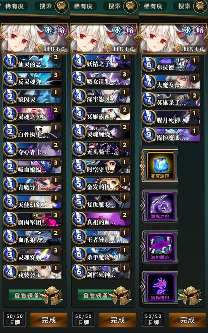 首先说一下装备,现在大多莉莉丝都带的火宝珠,斧子,潜行,这套装备非常稳定,5费能下一个6/4潜行带火珠效果。我这套装备则是4/2没有潜行但是有受伤加2/1和暴击,那为什么我选择这个装备呢?因为这套装备能让莉莉丝的5费英雄卡有单刷的机会。一套牌算上英雄牌是51张,任何一张能单刷对面的都能有橙红的强度了。首先在面对水和暗属性的时候,如果对面有解卡的牌,不论你是6/4还是4/2都没区别,其次在面对狐狸,