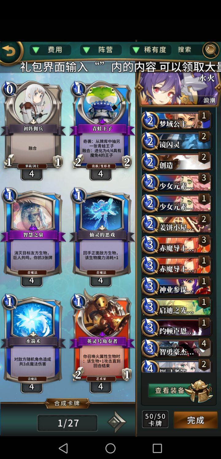 唯一的意思,就是零氪只看本攻略即可,其它任何攻略都不用看,看了也没有任何帮助,本攻略就是如此自信,原因后面会说。一,卡组和分析装备是火+1+1,+3攻击,潜行,吸血,装备不解释了吧,大家都这么带的。火莉莉丝是快攻卡组,我们首先要分析带多少张2费卡,才能保证2费摸到每回合稳定打脸呢,概率计算比较复杂,我写了个程序,直接贴结果吧。起手加换牌,如果卡组有4张2费,起手摸到的概率45.11%。这显然