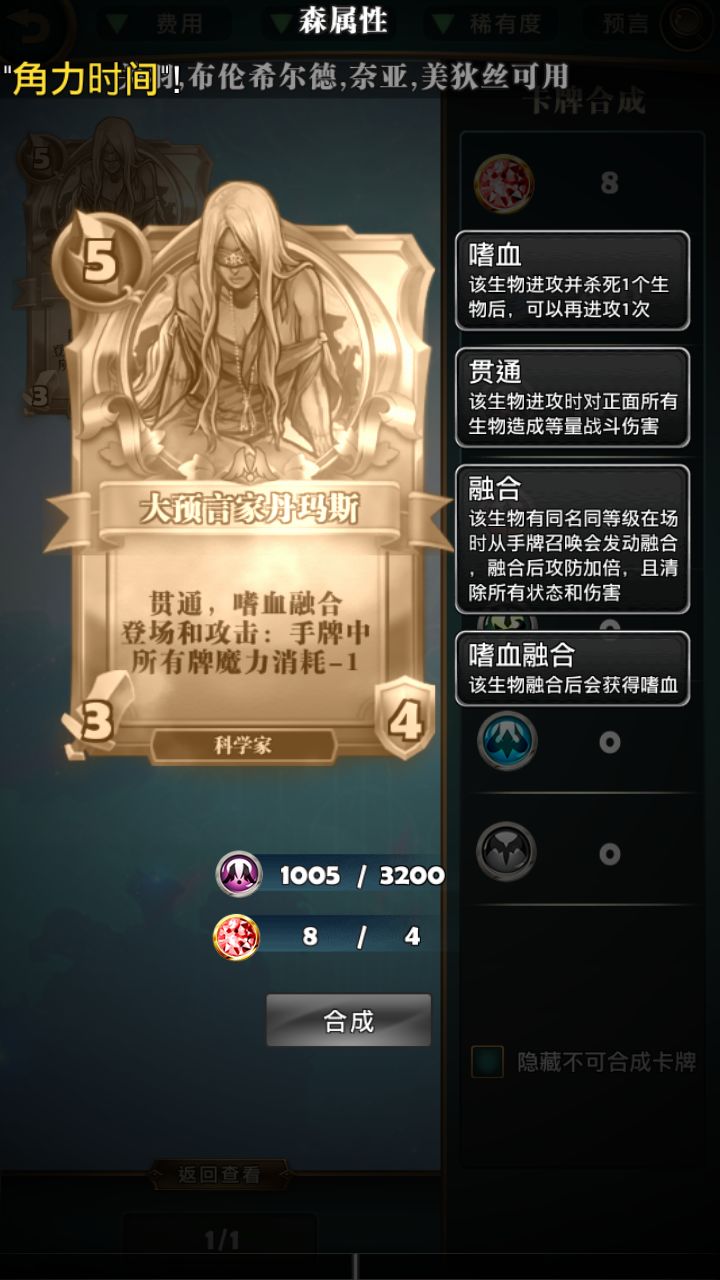 龙和天启(海龙和赤龙随缘,不建议合)龙所拥有的巨型可以保住场面,并能一换N,天启可以直接拉大优势。以下省略八张图。预言家 (强力绿色通用卡,登场和攻击都能给自己手牌减1费)配合绿色的启示录给的天启和绿色的高质量生物可以给对面带来不小的压力。发明家特斯拉(蓝色强力通用卡,登场和攻击可以授予自己一张科学牌,科学牌有两种,通古斯爆炸:全场牌手和生物减四 时间停止:破坏对面所有盖牌,并冻结双方所有生