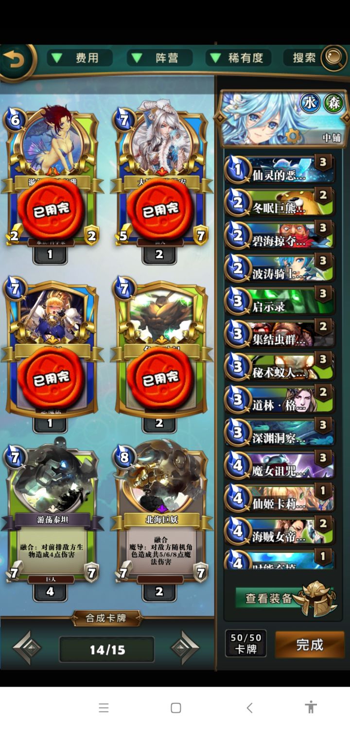这套卡组属于一个中速卡组,因为这游戏抽卡不稳定,所以搭配了三套核心。1.依靠科学家系列前期费用的提升,提前出大怪让对面头疼。2.启示录给的天启加上呱之类的控场最后蜂群潮汐返场。3.用女帝加道林之类的组合前期恶心对面。缺点:解卡不多,容易被莫名其妙的一张橙卡打崩,遇到解场多的职业需要算牌。先放两张卡组总览,接下来讲解单卡的选择和作用二费提升费用的牌控场+提升费用抽卡而且还可以让你下回合多两费