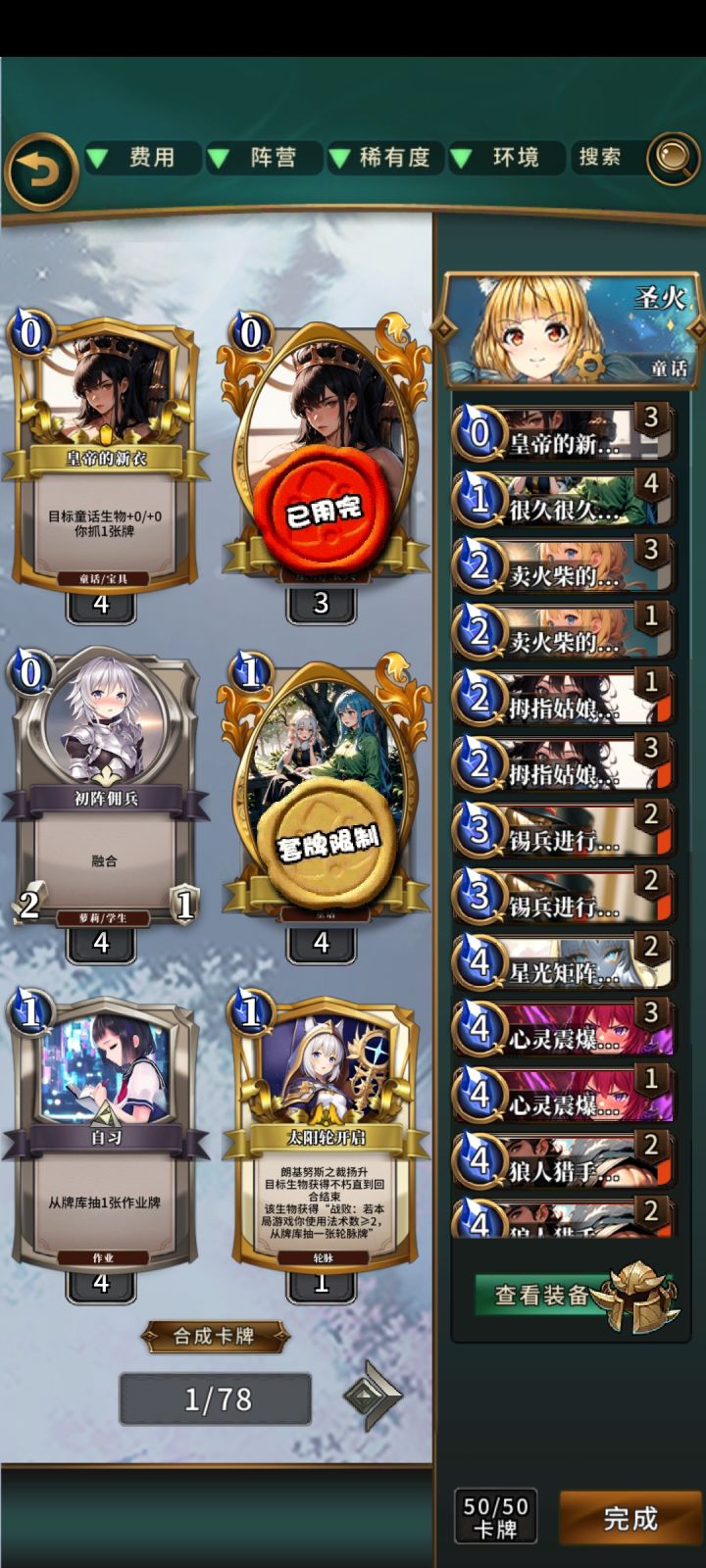 构筑如上,前期进行曲抢血,如果可以加个猎手bug,变成封印机器,这个情况下对面五魔力就被射死,到了中期,小红帽射脸,叠层,如果拖到后期,天鹅变形,洛基控制,集过牌,抢血,铺场,直伤一体的卡组,带个群体增益回血也很强,触发通灵嘎嘎快,什么卡组都可以打,上限很高装备思路:本体五费很合适,弥补了这个卡组没五费的真空期,如果卡手的情况下,可以迅速铺场解围,这套装备伤害高达九点,中期基本上谁碰谁死