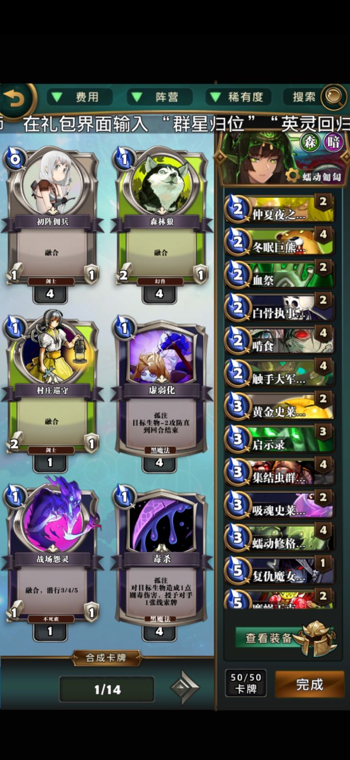 此攻略为喜欢乃亚,(你就是馋他的身(nai)子)和喜欢利用资源差来打开局面的玩家准备,初期攻略,并不全面,一个框架,可以按照自己的已有来做出不同的卡组。核心思路是利用大量挖坟牌和登场效果,达到反复横跳的娱乐场面,推荐登场抓拍,剧毒,加蓝,再生也还可以。前期有熊,剧毒树根,啃噬毒杀可以安稳解怪,仲夏夜尽量不要去掉,可以抗住一些直伤打脸,利用剧毒可以戒掉一些养怪的牌组的网瘾,血祭可以吃掉小树根来过