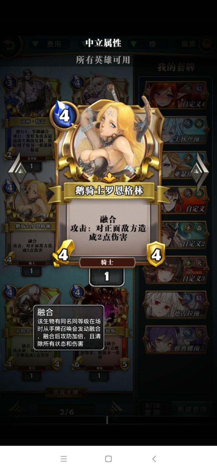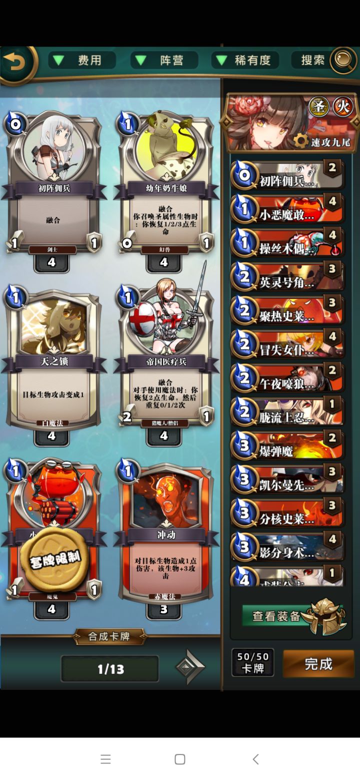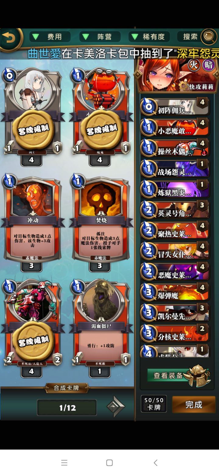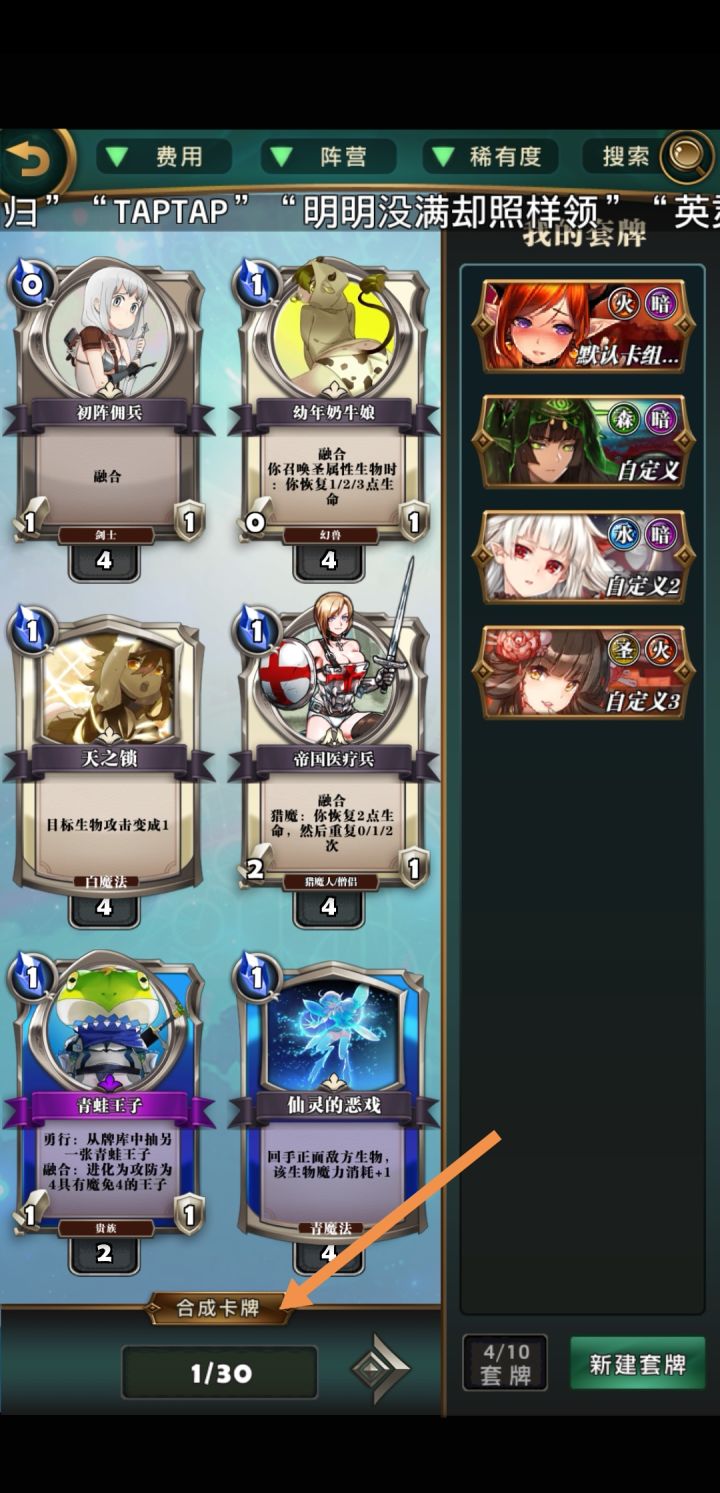 此帖针对不知道如何合成卡牌的真萌新,老玩家可以直接略过首先,进去组牌界面,找到合成卡牌的入口然后检索你要合成的卡,选项有费用、属性、稀有度、关键词,要是啥也记不清……那只能慢慢翻页了选择要合成的卡牌后,单击合成即可获得