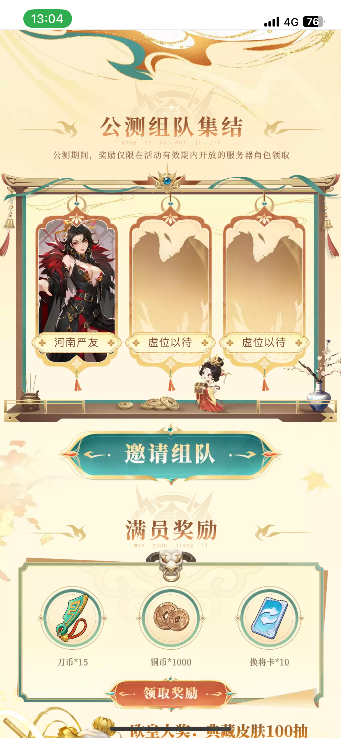 快来,一起拿奖励!《千机阵》公测组队抽典藏皮肤100 抽。 我这儿2缺1,点一下就行,咱俩能不能当欧皇就看这一波了https://qjz-team.joymogame.com/team/?phone=18924028437&team_id=ekyyk3&nick_name=%E6%B2%B3%E5%8D%97%E4%B8%A5%E5%8F%8B