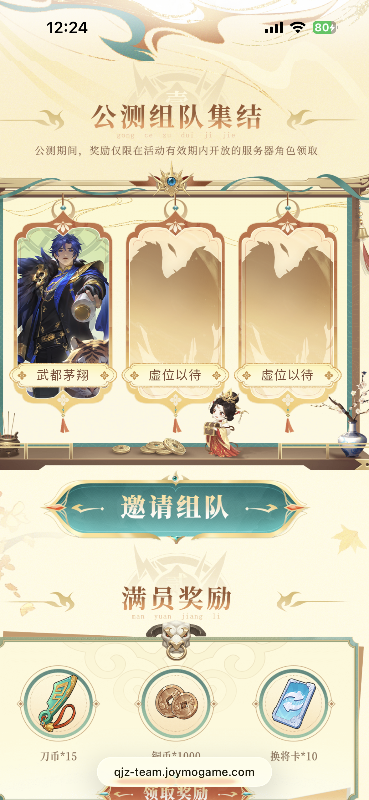 《千机阵》公测集结!我的阵容已就绪,组队差一位智囊,助我抽典藏皮100抽!https://qjz-team.joymogame.com/team/?phone=15515875333&team_id=ds43y1&nick_name=%E6%AD%A6%E9%83%BD%E8%8C%85%E7%BF%94