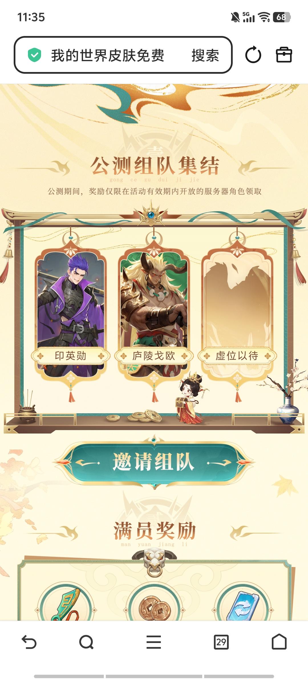 《千机阵》公测组队抽典藏皮肤100 抽。 我这儿2缺1,点一下就行,咱俩能不能当欧皇就看这一波了http://qjz-team.joymogame.com/team/?phone=18843512819&team_id=rm5qzk&nick_name=%E5%8D%B0%E8%8B%B1%E5%8B%8B
