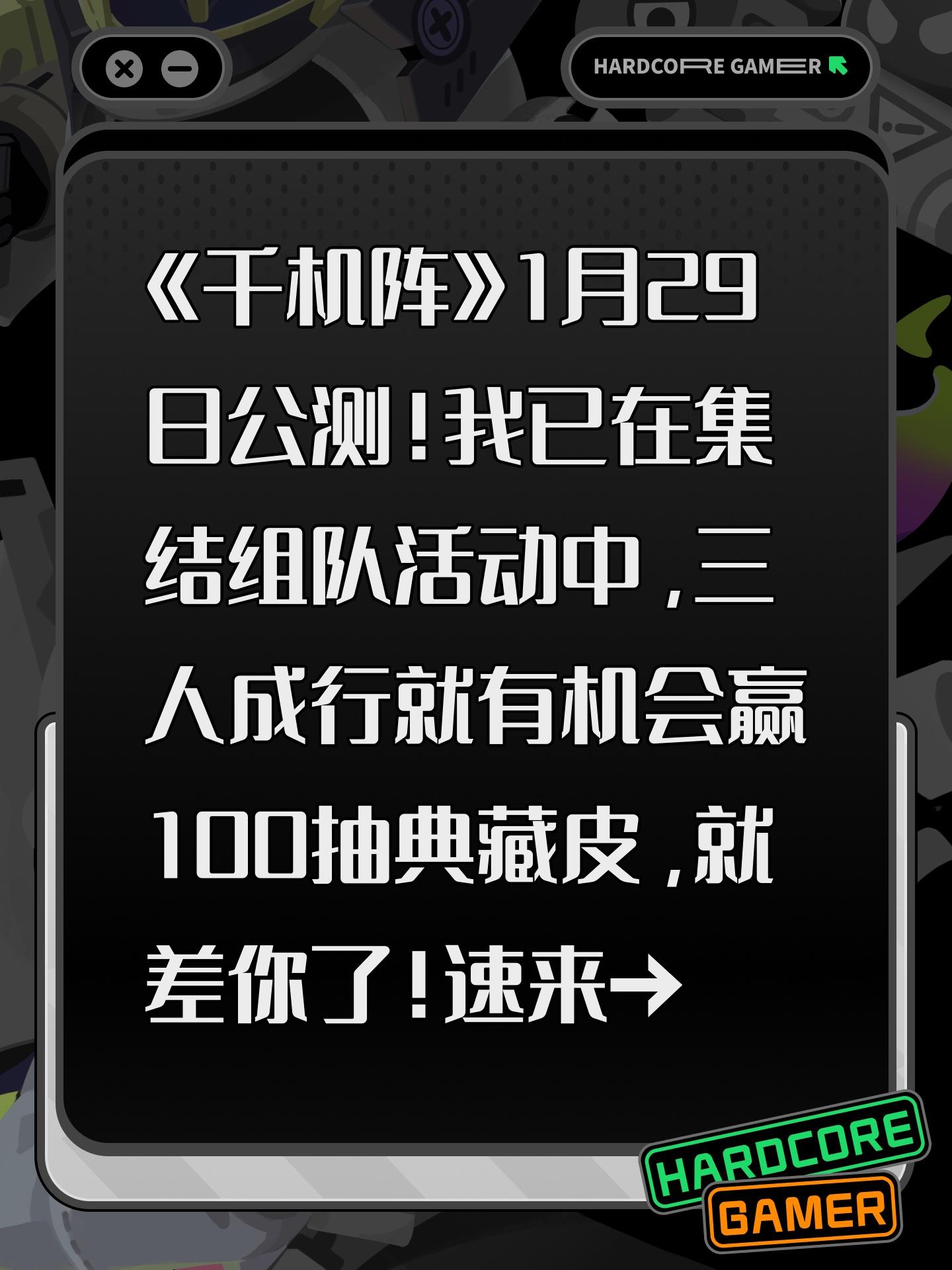 参与《千机阵》公测集结,三人成行就有机会获得典藏皮肤100抽!就差一个人,别让到手的福利飞了,速来上车https://qjz-team.joymogame.com/team/?phone=15548245491&team_id=84kcdb&nick_name=%E4%B9%90%E6%B5%AA%E7%A6%84%E8%8B%B1%E9%80%B8