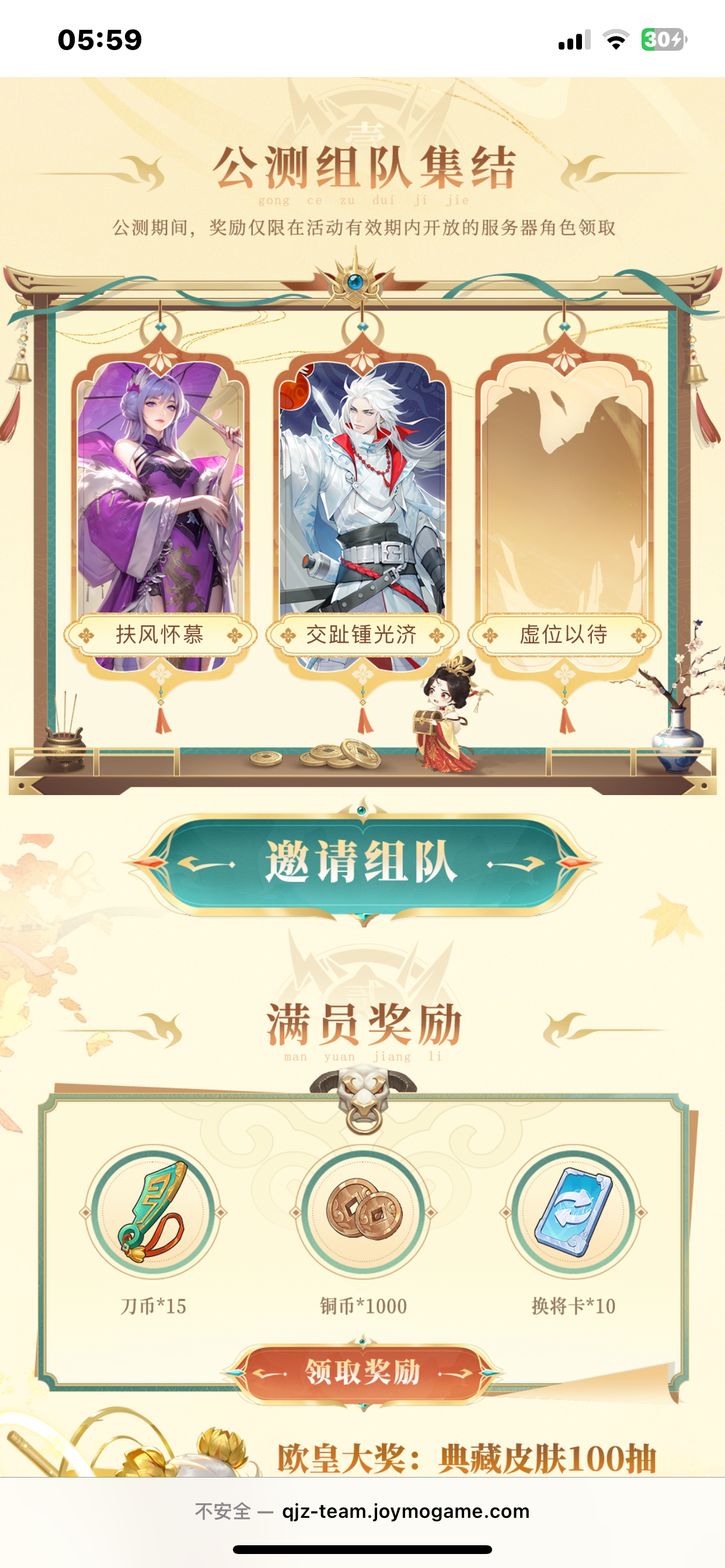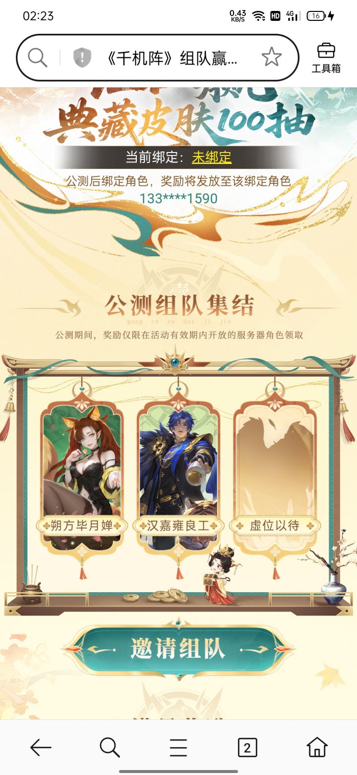 《千机阵》公测组队抽典藏皮肤100 抽。 我这儿2缺1,点一下就行,咱俩能不能当欧皇就看这一波了https://qjz-team.joymogame.com/team/?phone=15371208123&team_id=wh896m&nick_name=%E8%83%BD%E5%B3%BB